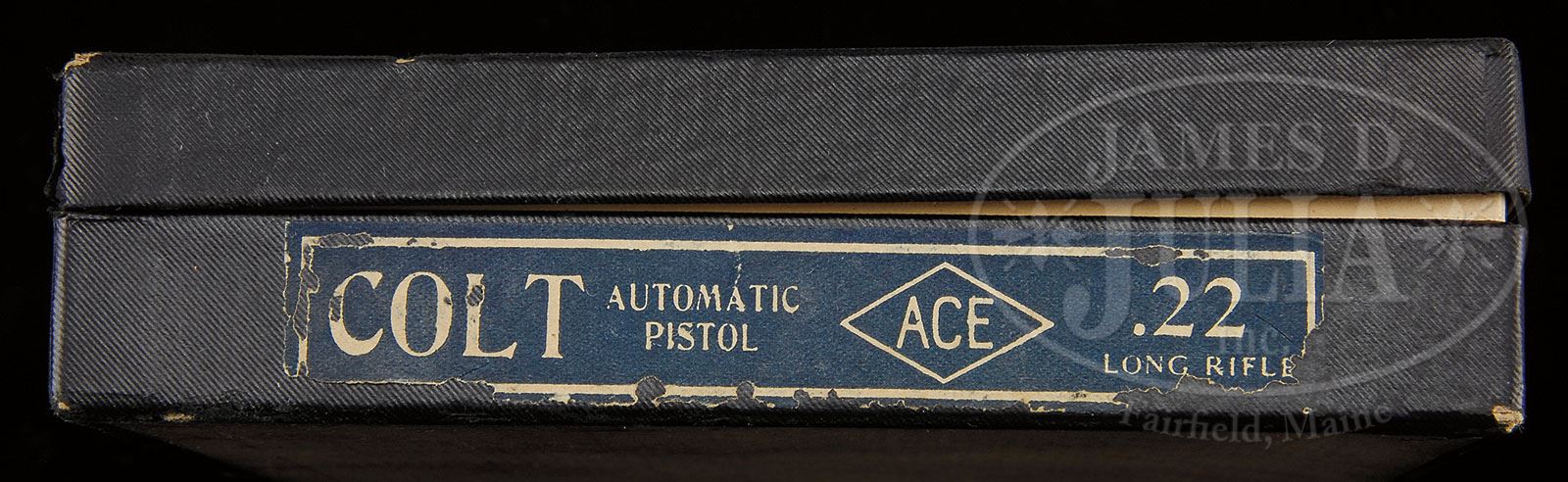*SCARCE PRE-WAR FIRST YEAR COLT CIVILIAN ACE SEMI-AUTO PISTOL WITH BOX.SN 3179. 22 Cal LR. Blue finish with 4-3/4″ solid bbl. Adjustable rear sight and usual address and patent markings on left side of slide with rampant Colt at the left rear end. Mounted with full checkered walnut grips and accompanied by orig 2-tone magazine with base plate marked “COLT” / “ACE” in diamond / “22LR”. Accompanied by its orig dark purple, hinged lid cardboard box, matching numbered in pencil to this pistol. Accompanied by an orig bi-fold owners pamphlet and a shooting suggestions pamphlet. According to The Book of Colt Firearms, Wilson there were about 11,000 of these pistols produced from 1931 to 1947, 10,500 of which were made through 1941. This pistol was produced in first year of production, 1931. CONDITION: Extremely fine. Overall retains about 97-98% crisp orig factory blue with only faint muzzle edge wear on the slide from laying in the box. Grips are crisp and show faint diamond point wear. Magazine is very fine with thinning on both sides. Mechanics are crisp. Brilliant shiny bore. Box is fine with 3 or 4 small edge nicks and a small tear in the paper covering on the bottom. End label is mostly complete with some damage and reduction at edges as can be seen in photos. Pamphlets are very good. 4-51956 JS87 (3,000-5,000) – Lot 3165