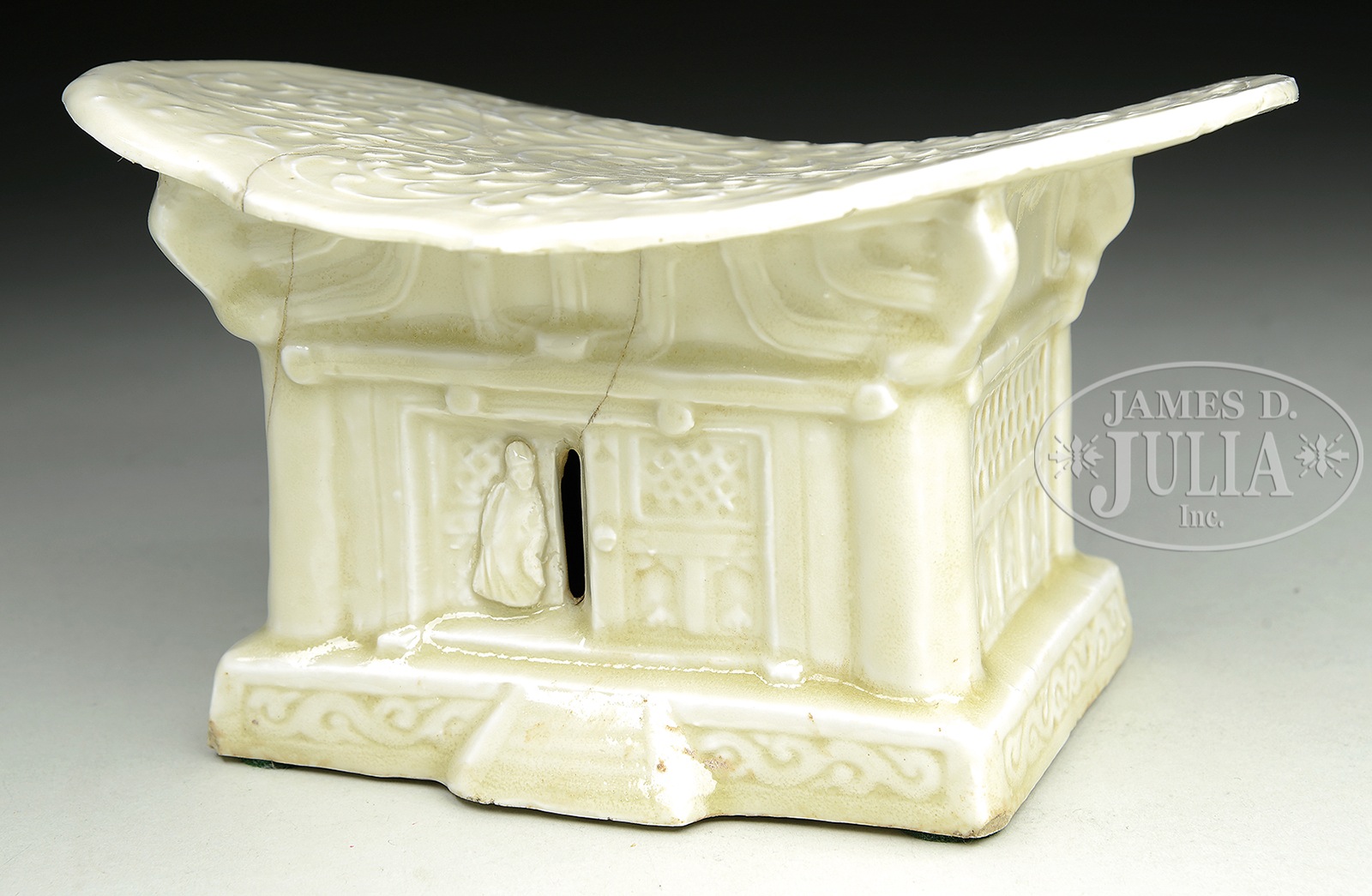 RARE DINGYAO PILLOW.The ruyi shaped headrest carved with dense floral scrolls, supported on a well modeled temple with walled panels and an attendant guarding a partially opened entrance door, old repair to cracks. SIZE: 5″ h x 9-1/4″ l x 7-1/4″ w. PROVENANCE: From a Northern California Family through descent from Dr. B. Engstrom of Stockholm, Sweden (bears label on bottom). CONDITION: Break and repair through body, an additional crack running through the body. 49935-18 (7,000-10,000) – Lot 3165