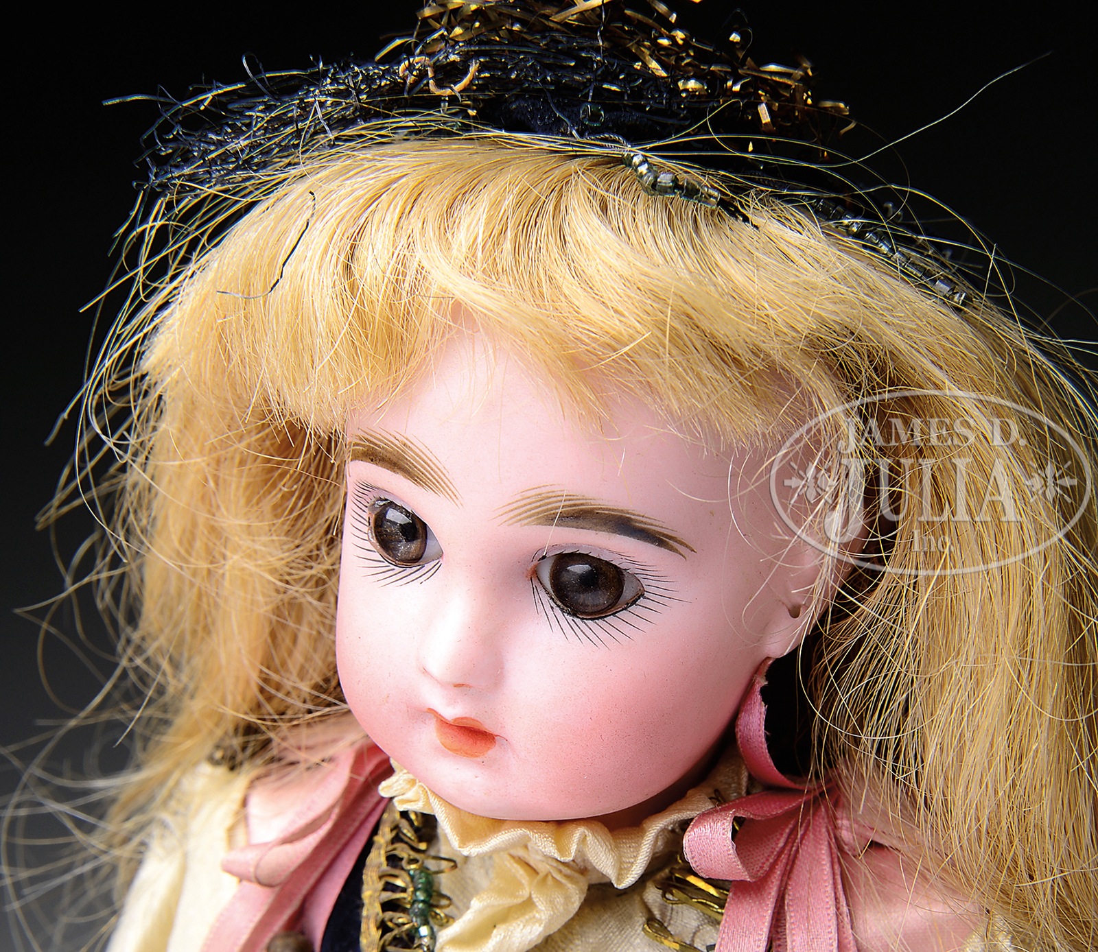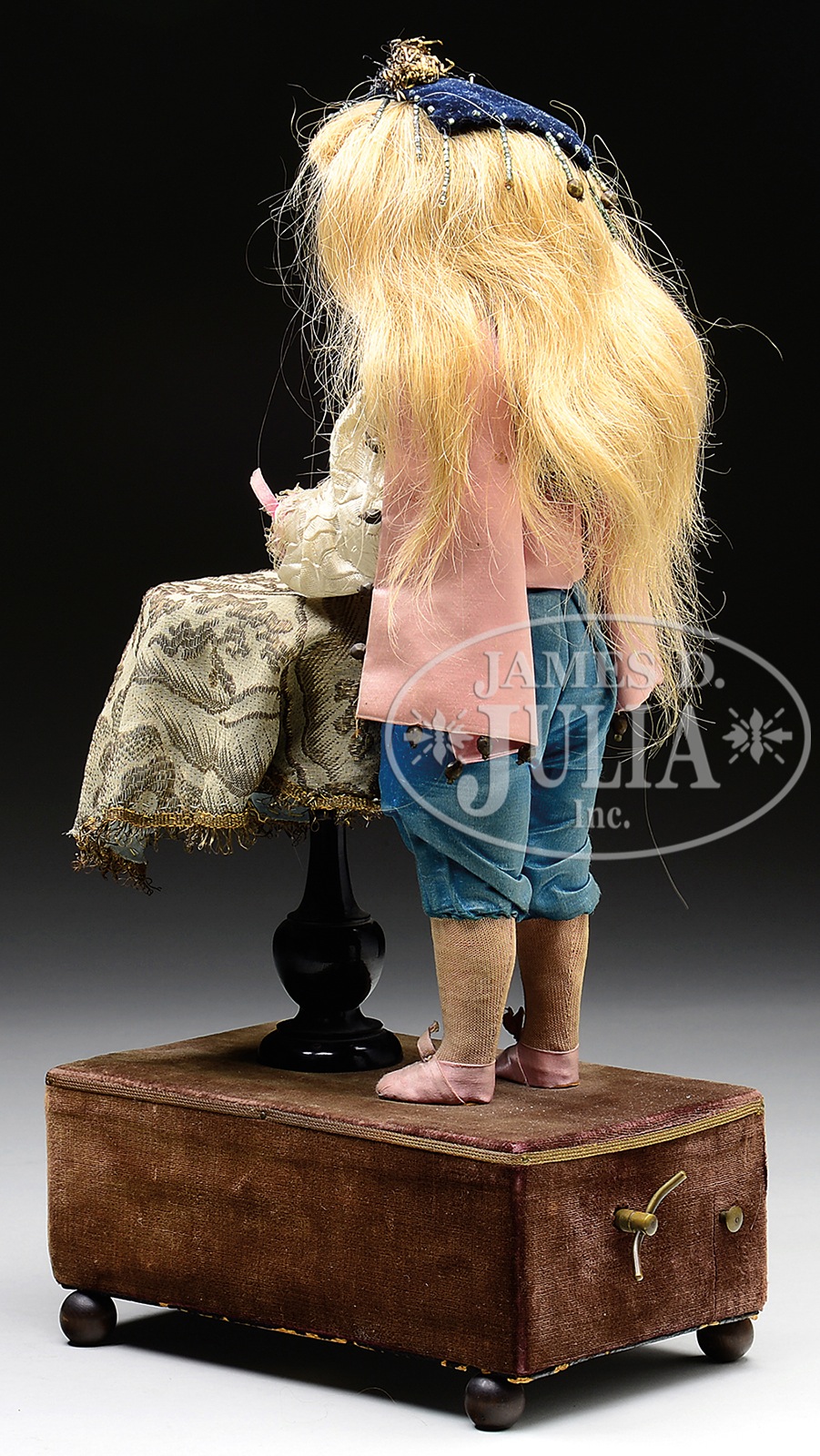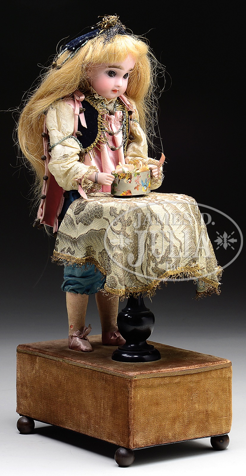 MUSICAL CLOCKWORK AUTOMATON.Figure has a flange neck unmarked Jumeau head with closed mouth, brown paperweight eyes, and well-painted lashes and brows. She stands at a table holding an oval basket of flowers. When the music is wound, she raises and lowers her arms, and the basket goes up and down. Each time she raises the basket a different item “magically” appears underneath. Her hands are made of bisque, costume appears to be mostly original. Die on table is a possible replacement. SIZE: Overall including base: 15-1/2″ (39cm). Figure: 12″ t (31cm). CONDITION: Overall very good with strong music and well functioning mechanism. 1-14043 (2,000-3,000) – Lot 3166 Auction: Advertising, Toy & Doll - Spring 2014 Please Note: All prices include the hammer price plus the buyer’s premium, which is paid by the buyer as part of the purchase price. The prices noted here after the auction are considered unofficial and do not become official until after the 46th day. |