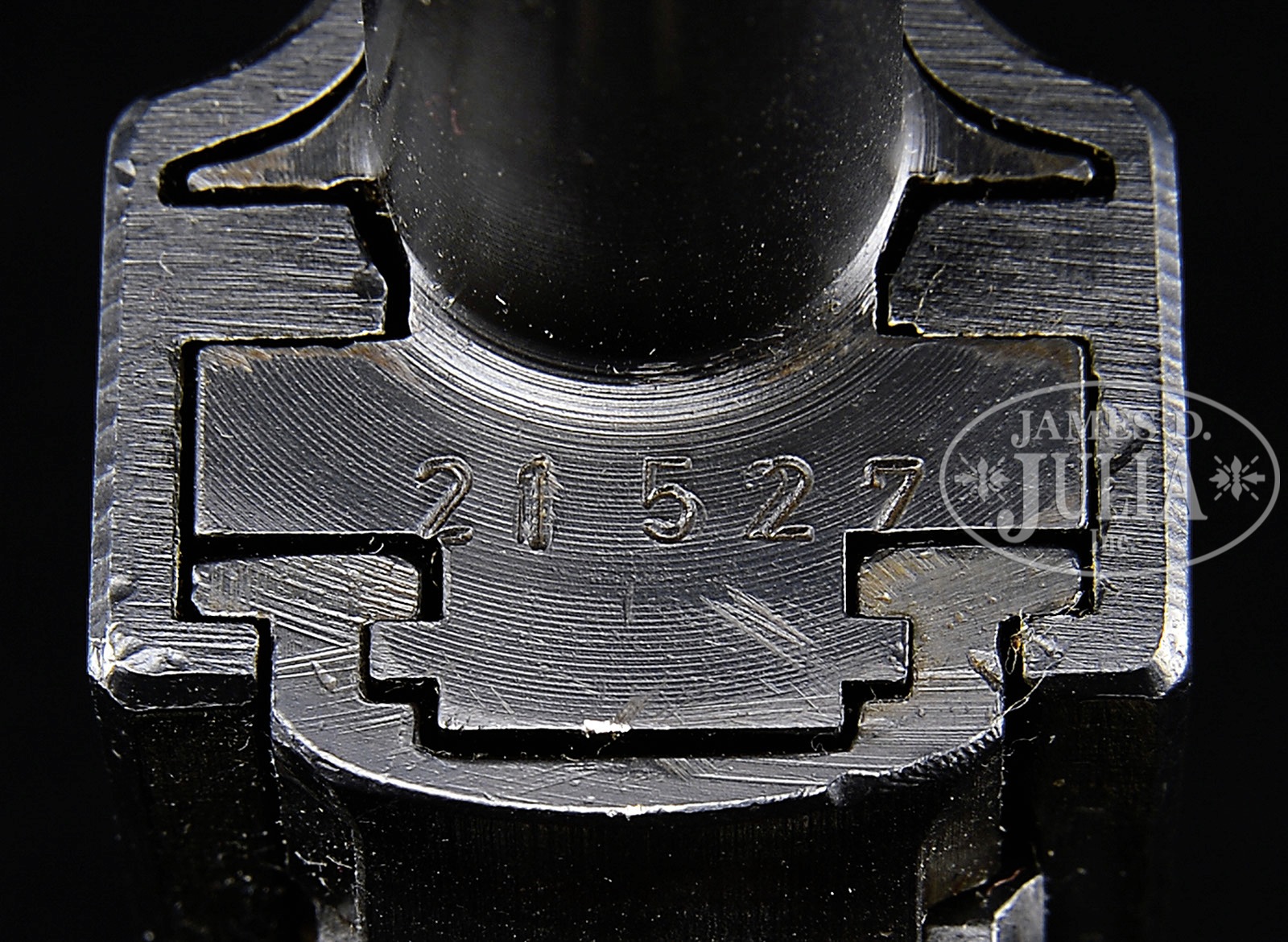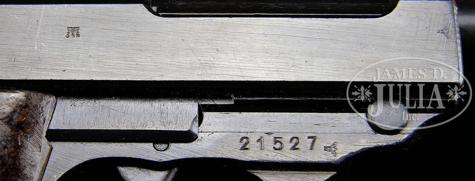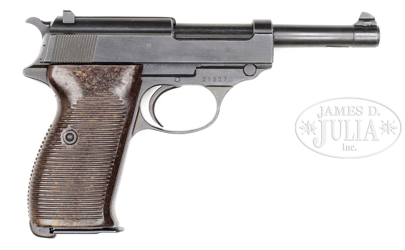 *◊ WALTHER MODEL HP MILITARY PROCUREMENT VARIATION 2.SN 21527. 4-7/8″ 9mm bbl with full SN on front and Eagle/N proof on right side behind slide. Walther Banner “Waffenfabrik Walther,Zella-Mehlis (Thur)/Walther’s patent Cal 9m/m” followed by “Mod. HP” on left slide. Eagle/359 on left side of hammer spur. Exposed extractor and round firing pin. Right side of slide has Eagle/N proof on front and military Eagle/359 above grip. Brown bakelite serrated grips. All numbered parts are matching. Magazine is jvc code with Eagle/WaA766 proof. PROVENANCE: Collection of Dr. Geoffrey Sturgess. CONDITION: Excellent. Retains 98% arsenal dip blue finish. Bore is bright and sharp. Grips are excellent with light wear. Magazine is excellent and retains 98% blue. Mechanics are excellent. 4-53302 BWS116 (800-1,500) – Lot 3167