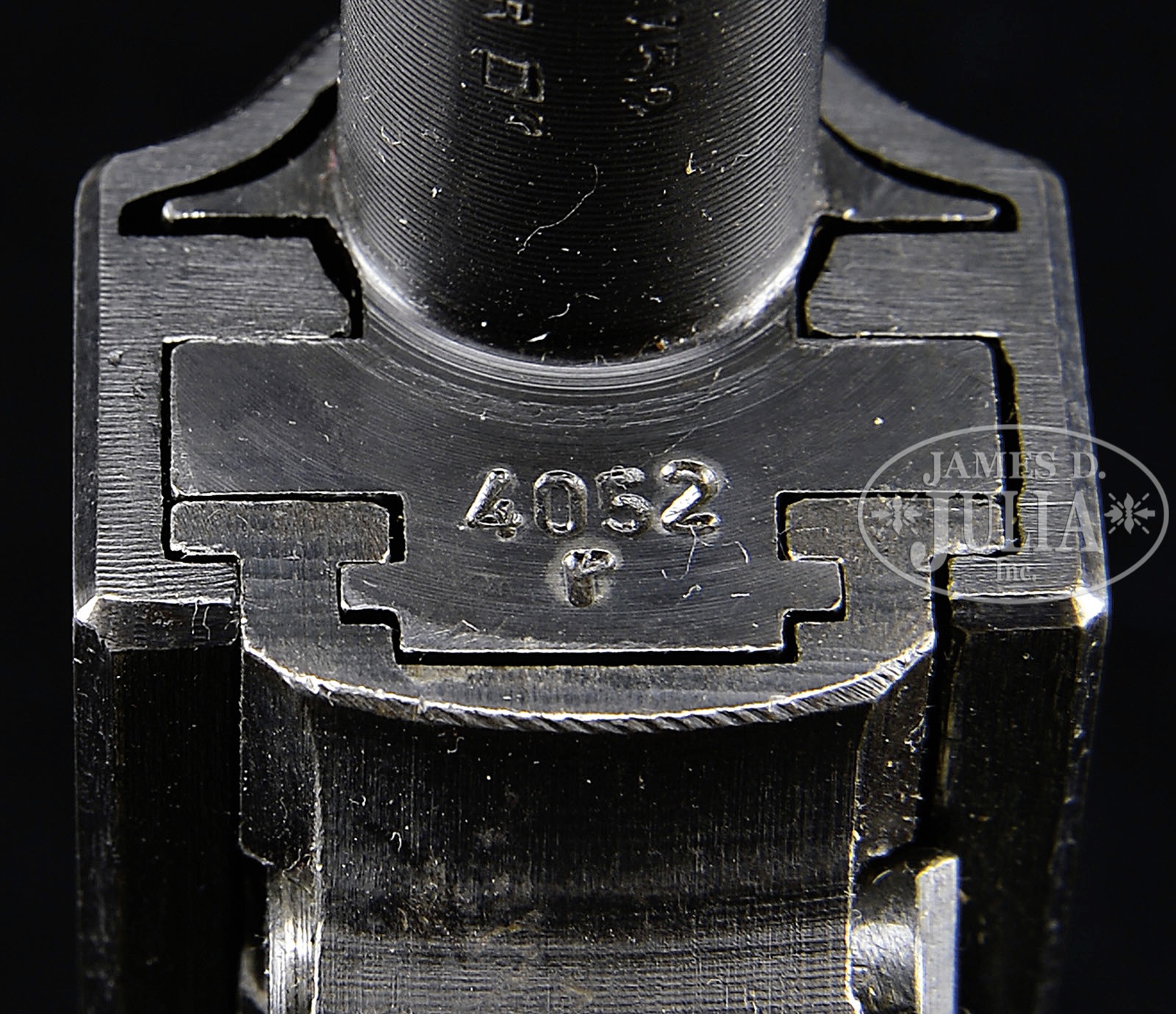 *◊ MAUSER P38 BYF44 SUBVARIATION 2.SN 4052R. 4-7/8″ 9mm bbl with full SN on front and Eagle/WaA135 on left side behind slide. British proofs. “P. 38” followed by “byf/44” and full SN on left slide. Right side of slide has Eagle/WaA135 proofs. Eagle/WaA135 on left side of frame. Exposed extractor and round firing pin. All numbered parts are matching. Brown bakelite serrated grips. P38 marked magazine with “jvc” and Eagle/WaA135 proof. PROVENANCE: Collection of Dr. Geoffrey Sturgess. CONDITION: Excellent. Retaining 95% blue with most wear on front grip strap. Bore is bright and sharp. Grips are excellent with little wear. Magazine is excellent and retains 97% blue. Mechanics are excellent. 4-52639 BWS122 (750-1,250) – Lot 3168