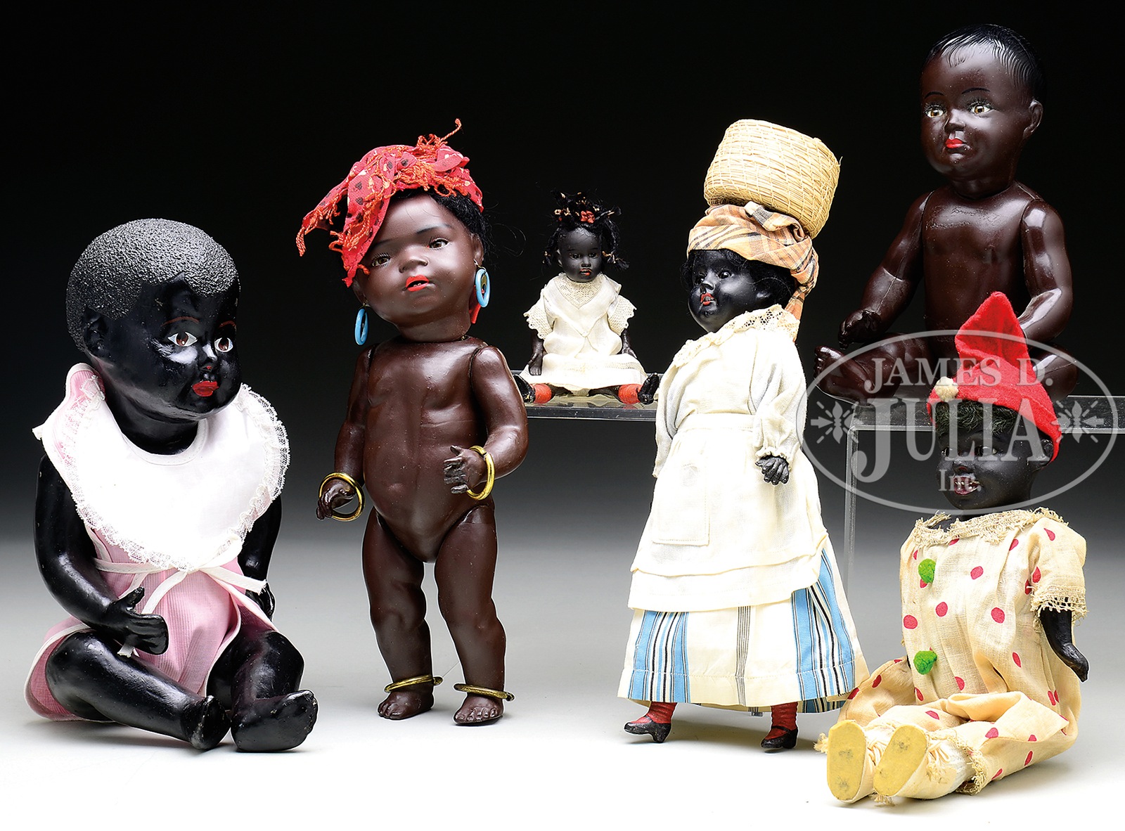 LOT OF SIX MISCELLANEOUS BLACK DOLLS.Included are a painted bisque doll by Koppelsdorf incised “344”, two black bisque dolls, one dressed as an island woman and incised “A.M.” with a smaller bisque girl by “Kuhnlenz” with 5-piece composition body. In addition, there is a shoulder head composition clown doll, a composition baby doll with realistically modeled hair, and an all-celluloid doll with swivel neck and molded and painted features. SIZE: Largest: 13″ t (33cm). Smallest: 5-1/2″ t (14cm). CONDITION: Good to very good. 1-14068 (300-500) – Lot 3168 Auction: Advertising, Toy & Doll - Spring 2014 Please Note: All prices include the hammer price plus the buyer’s premium, which is paid by the buyer as part of the purchase price. The prices noted here after the auction are considered unofficial and do not become official until after the 46th day. |