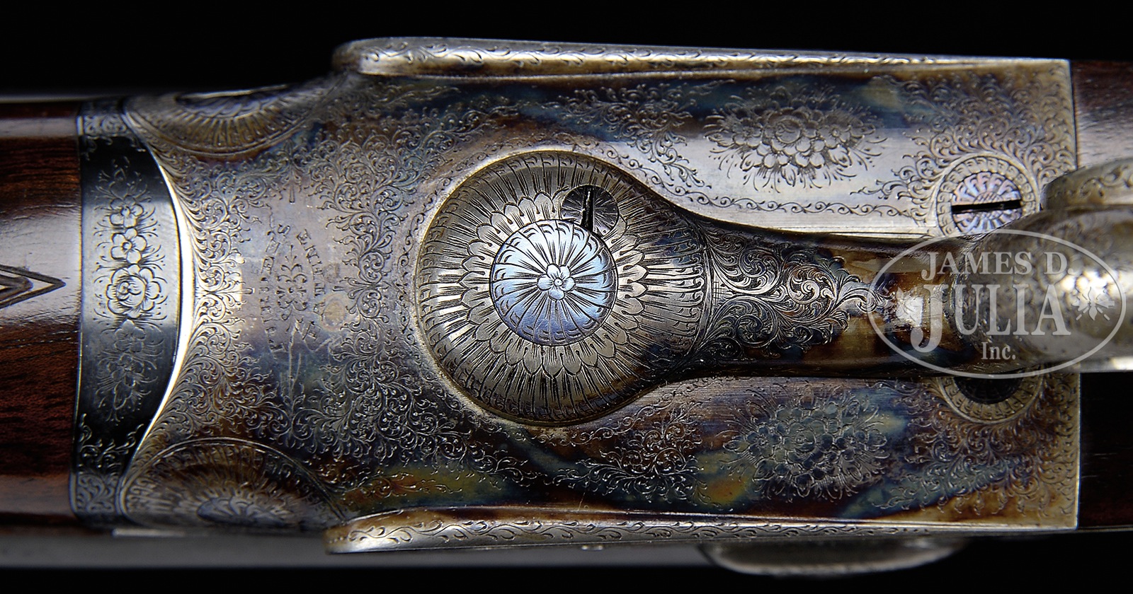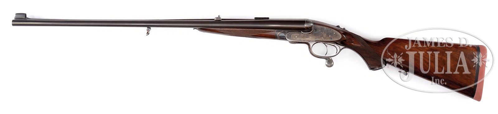 *VERY FINE J. PURDEY HAMMERLESS SELF-OPENING SIDELOCK UNDERLEVER DOUBLE RIFLE.SN 17340. (1901) Cal. 9.3X74R. This scarce rifle with fewer than 450 hammerless rifles produced, was originally made for the 400/360 Purdey, and subsequently converted to 9.3 x 74R. It has 26″ chopper lump bbls fitted with full length partially file cut rib. Central portion is engraved with Purdey name and Audley House address, and Whitworth steel information. A windage adjustable one standing, one folding leaf express rear sight is dovetailed through, and front portion is cut away forming slight ramp holding tall silver bead. A sight protector, SNed to this gun, is in place. Rear portion of rib has been drilled and tapped for scope mounts. Front base is still in place. Bbl flats are stamped with orig London nitro proofs for 40 grains of cordite and 300 grain bullet, as well as 1990 London re-proofs for 93X74, along with importers initials and address (“WRA Bozeman. MT”). SNs are stamped on bottoms of bbls along with “G.A” (head bbl maker G. Aston). Tube nos “1550” and “1551” are on loop. A sling loop is soldered to bottom of rib. Case hardened, sidelock, self-opening, Beesley patent action with reinforcing bolsters and spring loaded Jones underlever features automatic safety (SAFE inlaid in gold) which is fitted with pivoting bolt with BOLTED in gold. Rifle also features third fastener, side clips, bushed strikers, engraved arrow tumbler end cocking indicators, and dbl triggers. Action is engraved with classic, well cut, Purdey house style rose and scroll. “J. Purdey & Sons” is at the bottom of each lockplate. Top strap is engraved “Patent”. Bottom of action is engraved “Purdeys” “Patent”. Scroll engraved trigger guard has SN on tang, which extends to engraved steel grip cap. Lightly figured and marbled, dense, European walnut capped pistol grip buttstock measures 14-1/4″ over Silver type pad. A sling loop matching that on bbl, and a silver oval engraved “H.G.H.” are on toe line. Matching splinter forend with Anson release, is stamped with actioners initials “WN” (Wesley Nobbs). Drop at heel: approx 2-11/16″, drop at comb: approx 2″. Cast: approx 1/4″ on. Weight: 9 lbs. 14 oz. LOP: 14-1/4″. CONDITION: Excellent, as partially refinished. Bbls retain 80 – 85% what appears to be orig blue, thinning from normal hand wear, with a few splotches and marks. Action and lockplates retain over 80% of what appears to be their orig case hardening color, silvered on edges and beads. Stocks retain nearly all of an old oil refinish, sharp edges preserved, with a number of subsequent marks and scratches. Pins, grip cap, and triggers re-blued. Pad is new. Bores are very fine to excellent, shiny, strong rifling throughout, with a hint of erosion at breech ends. Action is tight. Bbls are on face. Drop is good. A fine old Purdey rifle in a highly regarded, obtainable caliber. 51065-1 MGM280 (8,000-14,000) C&R – Lot 3168