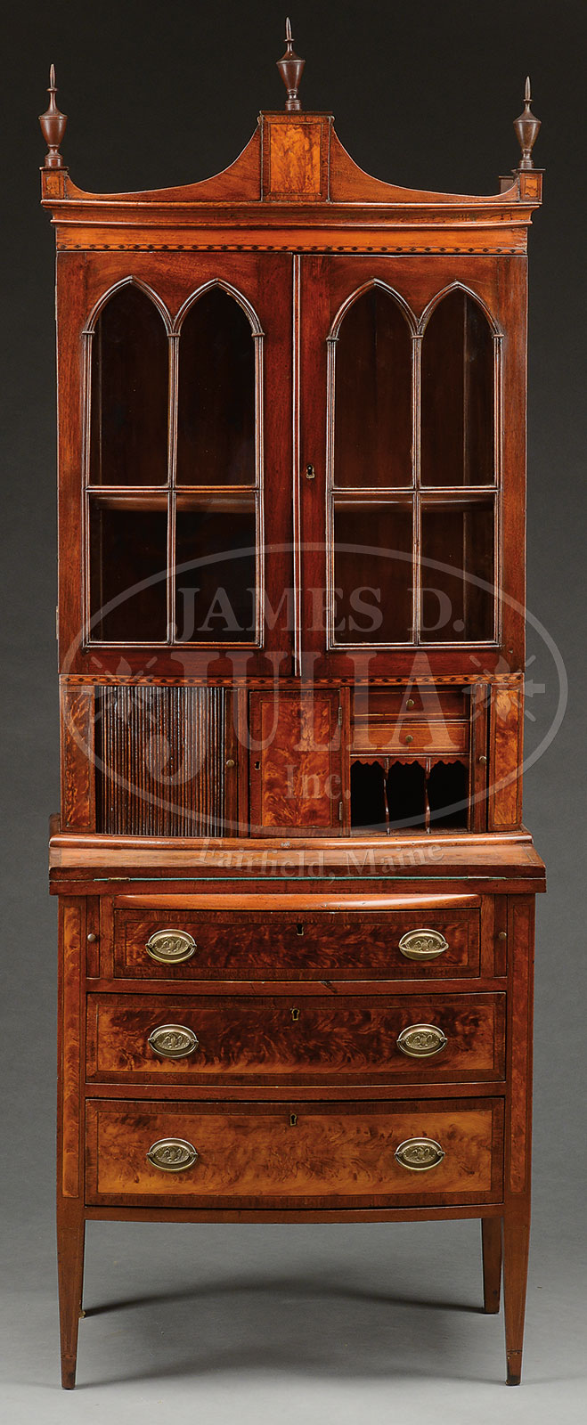 DIMINUTIVE FEDERAL STYLE INLAID MAHOGANY SECRETARY BOOKCASE.Second quarter 20th century. This fine benchmade example in two parts, the upper section with pediment cresting fitted with three classical urn form finials above a pair of astragal-glazed doors with gothic arches over a pair of tambour slides centering a prospect door, all opening to interiors fitted with valanced pigeon holes and small drawers. Stepped back on the lower case with hinged baise-lined writing surface resting on lopers centering three long drawers all with figural mahogany rectangular panels within cross-banding and all with bow fronts. Raised on square tapered legs. SIZE: 81″ h x 29″ w x 20″ d. PROVENANCE: Collection and shop contents of Linda and the late Vito Peri (owners of the Blue Dolphin Antique Shop, Northport, Maine). CONDITION: With nicely polished figured surfaces. Inlays and veneers intact. Very good. 52380-12 (1,200-1,800) – Lot 3168