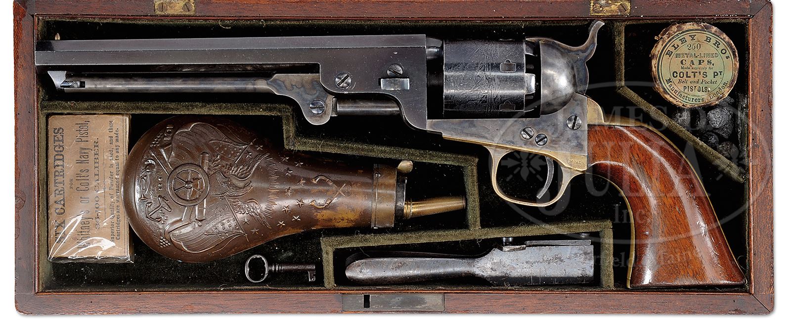 EXCEPTIONAL CASED COLT MODEL 1851 NAVY PERCUSSION REVOLVER.SN 202972. Cal 36. Blue & color case hardened with 7-1/2″ oct bbl, brass pin front sight and 1-line New York address with dashes. Left side of frame is marked “COLTS PATENT” and left shoulder of trigger guard is marked “36 CAL”. Cylinder is usual 6-shots with Ormsby naval battle scene roll marking and all 6 safety pins are crisp. The silver plated brass trigger guard & backstrap contain a nicely figured, varnished, 1-pc walnut grip. Accompanied by a mahogany, dark green cloth lined casing which is compartmented for the revolver, a fine eagle flask, an iron 2-cavity “COLTS PATENT” mold marked “36 B” (belt model), fine pack of wrapped paper cartridges, an orig paper wrapped tin of Eley’s caps and a functioning key. This is a beautiful cased gun retaining most of its orig bright blue finish and case colors. PROVENANCE: The Estate Collection of Phil A. Bleakney, Jr. CONDITION: Extremely fine plus, all matching though not disassembled to check for internal SNs. Bbl and cylinder retain about 95%+ bright blue with only edge wear. Loading arm, frame and hammer retain 90%+ case colors. Finish appears touched up in areas as many small nicks appeared recolored. Trigger guard & backstrap retain strong traces of silver plate with balance a mustard yellow patina. Grip is crisp with a couple small bruises & retains about 95% of its orig varnish with edge wear. Mechanics are crisp, bright shiny bore with a few scattered spots of staining and light pitting. Case is sound and solid retaining most of a varnished finish. Green cloth lining has areas of fading, wear and soiling. Flask is fine overall retaining 90% its orig varnish. Cap tin is sound with paper wrap worn and oil stained, still sealed with good discernible paper label. Cartridge pack is fine and solid. Mold retains about half of its blue finish with numerous small dents and dings with clear markings. 49059-77 JS (8,000-12,000) – Lot 3170