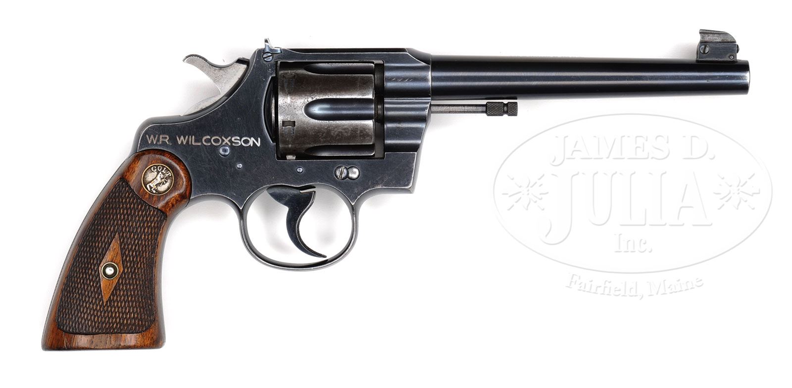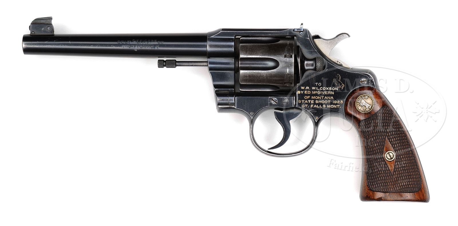 *VERY RARE COLT HEAVY BARREL OFFICER’S MODEL DA REVOLVER SHIPPED TO FAMOUS QUICK DRAW ARTIST AND AUTHOR ED MCGIVERN.SN 431531. Cal. 38 Special. Blue finish with 6″ tapered rnd bbl, adjustable front and rear sights, marked on left side “COLT OFFICERS MODEL 38 / *HEAVY BARREL*”. Left sideplate is pantograph engraved through the blue “TO / W.R. WILCOXSOM / BY ED McGIVERN / OF MONTANA / STATE SHOOT 1923 / GT. FALLS MONT”. Right side of frame is engraved in larger letters “W.R. WILCOXSOM”. Mounted with 2-pc diamond checkered walnut grips with deep left and right Colt silver medallions, matching numbered to this revolver. Accompanied by an old Colt Factory Letter dated 1966 which identifies this revolver in cal 38 with 6″ bbl, blue finish, type of stock not listed, sold and shipped to Ed McGivern, Montana, on July 19, 1919 in a one gun shipment. Also accompanied by a hand printed letter by Mr. McGivern titled “Certificate”. Body of letter states “I hereby certify that the “Colt Officers Model” caliber .38 Revolver serial number 431531 was originally shipped direct to me while in Lewistown, Montana during the year 1919. Shipment was courtesy of the Colt Factory end at no cost to me, through a mutual friend Leonard C. Davis of Colt’s Patent Firearms Company. I gave the gun to my friend R. Wilcoxsom at the state shoot held in Great Falls, Montana in the year 1923. The gun was engraved on the right side of the frame with his name “W.R. Wilcoxson” on the left frame panel it was engraved: To / W.R. Wilcoxson / By Ed McGivern / of Montana / State Shoot – 1923 / Great Falls, Mont.” Also accompanied by a type-written note from Mr. Yearout which states that Mr. McGivern had the revolver engraved locally in Lewistown, Montana. Ed McGivern was a merchant in Montana with an interest in shooting who developed rapid draw and fire techniques which are still being taught today. He became the world’s fastest and most accurate handgun shooter, establishing records, some of which still stand today. He became an exhibition shooter and authored several books and numerous papers about quick draw and shooting, the most well-known of which is Fast and Fancy Revolver Shooting in 1938. While Mr. McGivern was given numerous firearms throughout his career very few are known today, especially available on the open market. Mr. McGivern is recorded in old movies demonstrating his shooting with double action revolvers, perhaps this one may have been in one or more of those movies. PROVENANCE: Estate Collection of Lewis & Leyton Yearout. CONDITION: Fine, bbl and frame retain 92-94% strong orig blue with only light sharp edge wear and a couple of small dings. Cyl retains 30-40% orig blue in the flutes with the outer diameter a blue gray patina. Trigger and hammer retain about all of their bright fire blue with sides of the hammer polished bright. Grips are sound with a bruise on the left bottom edge and show moderate diamond point wear, retaining about 75-80% orig varnish. Mechanics are crisp. Bright shiny bore. 4-53957 JR191 (3,000-4,000) – Lot 3171 Click here to view provenance