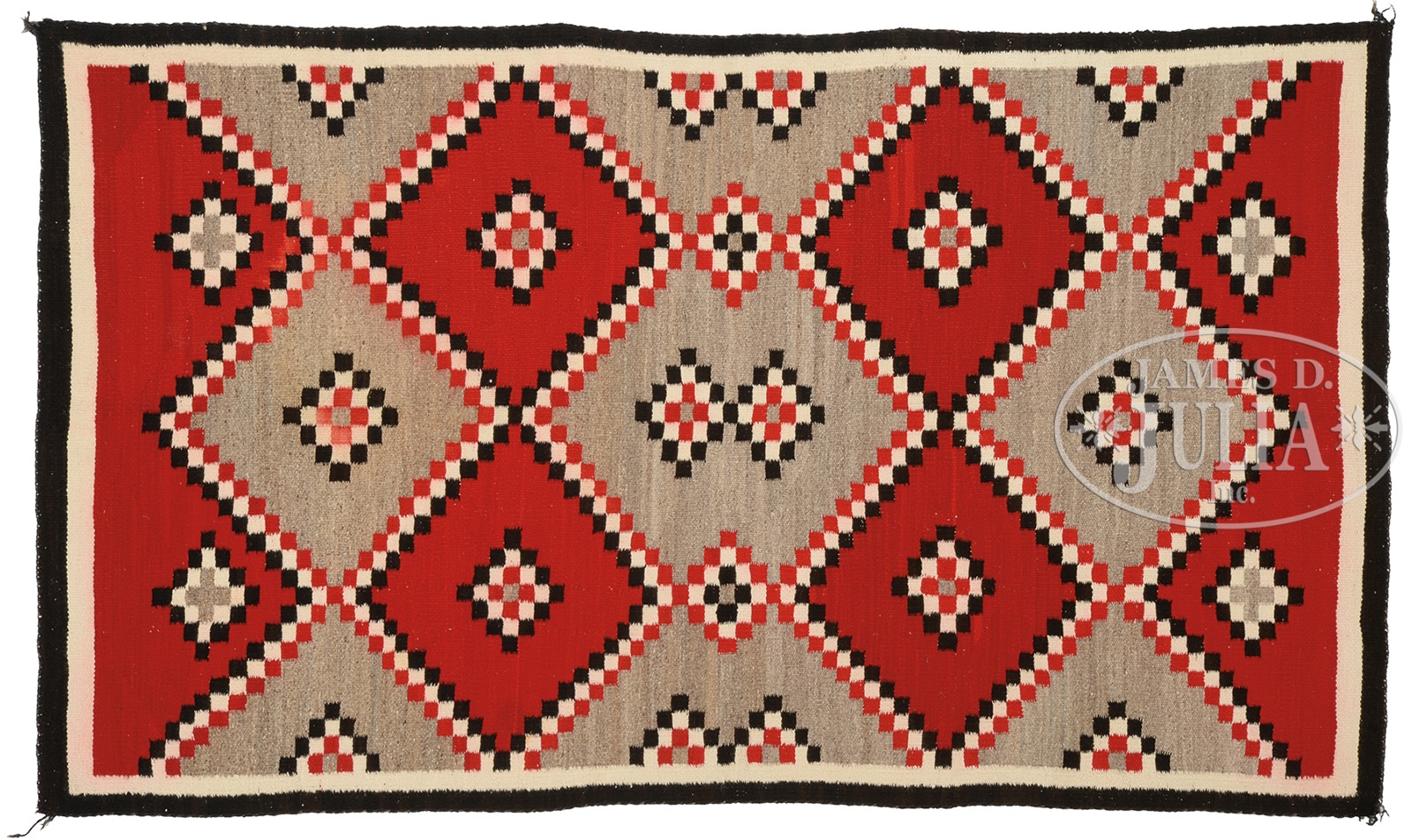 Typical diamond step pattern in red, brown, white and camel. SIZE: 74″ l x 43-1/2″ w. CONDITION: Minor bleed and some fading. 49355-47 (250-350) – Lot 3175