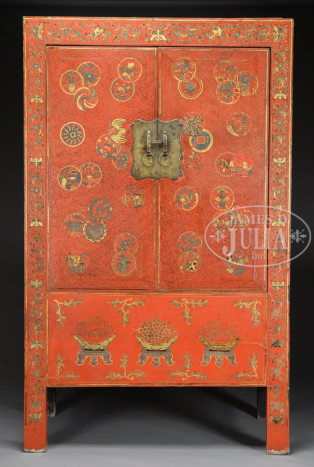 RED LACQUERED CABINET.18th/19th century, China. Red lacquered cabinet having a surface decorated with brocade roundels, butterflies and flowers, and a shaped lockplate. SIZE: 80″ h x 49″ w x 25-1/2″ d. PROVENANCE: From a private New York State collection. CONDITION: Generally good, with rubbing and loss to lacquer with craquelure. 9-92501 (400-600) – Lot 3179