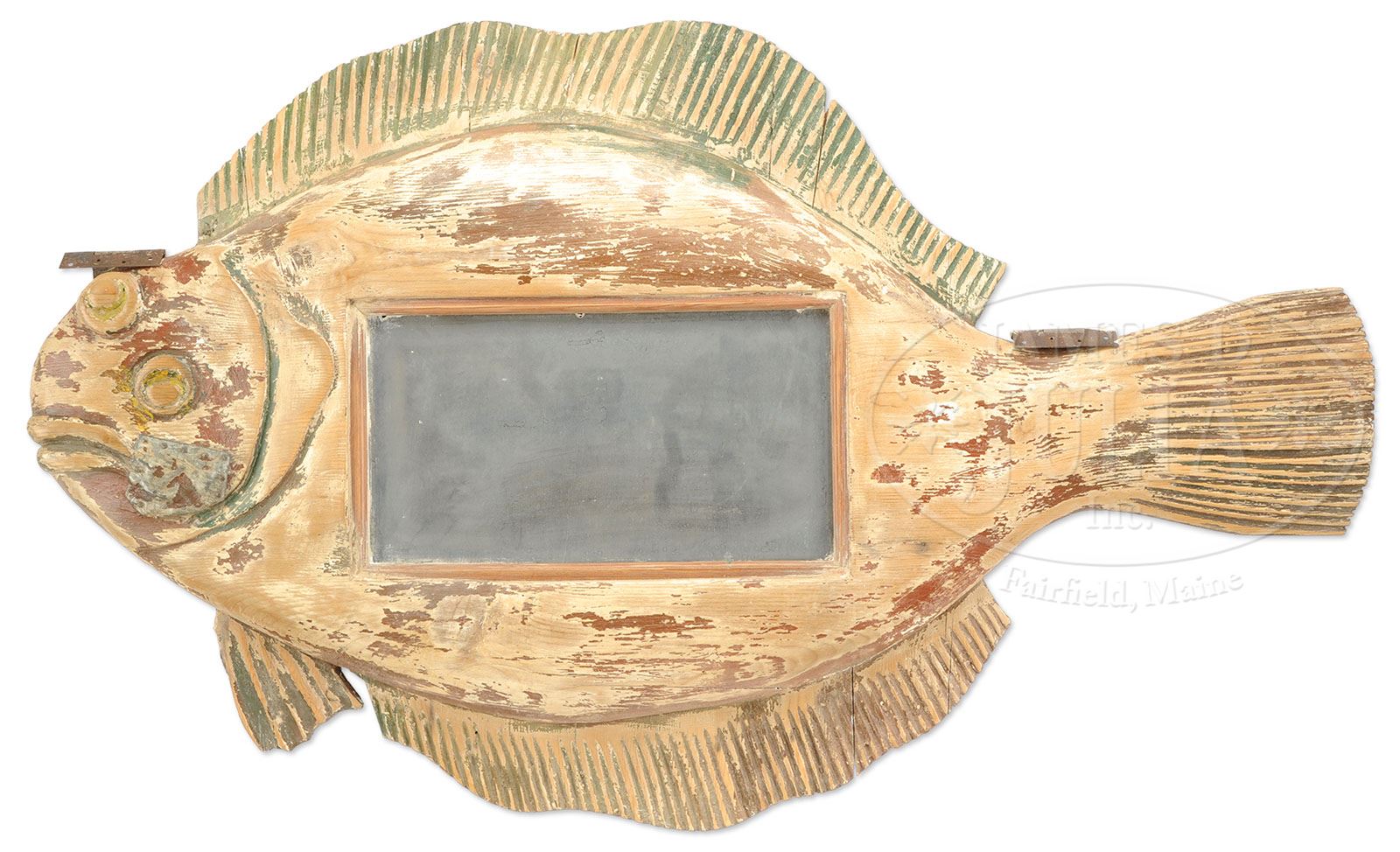 CARVED PINE FLOUNDER MENU BOARD. 20th century. Carved in the form of a flounder with traces of paint and is centered with a slate chalkboard. It is mounted with wrought iron hanging straps above the head and the tail. SIZE: 40″ h x 65″ w. CONDITION: Good overall, has a tin patch repair and heavy loss to the paint. 9-92364 (2,000-3,000)