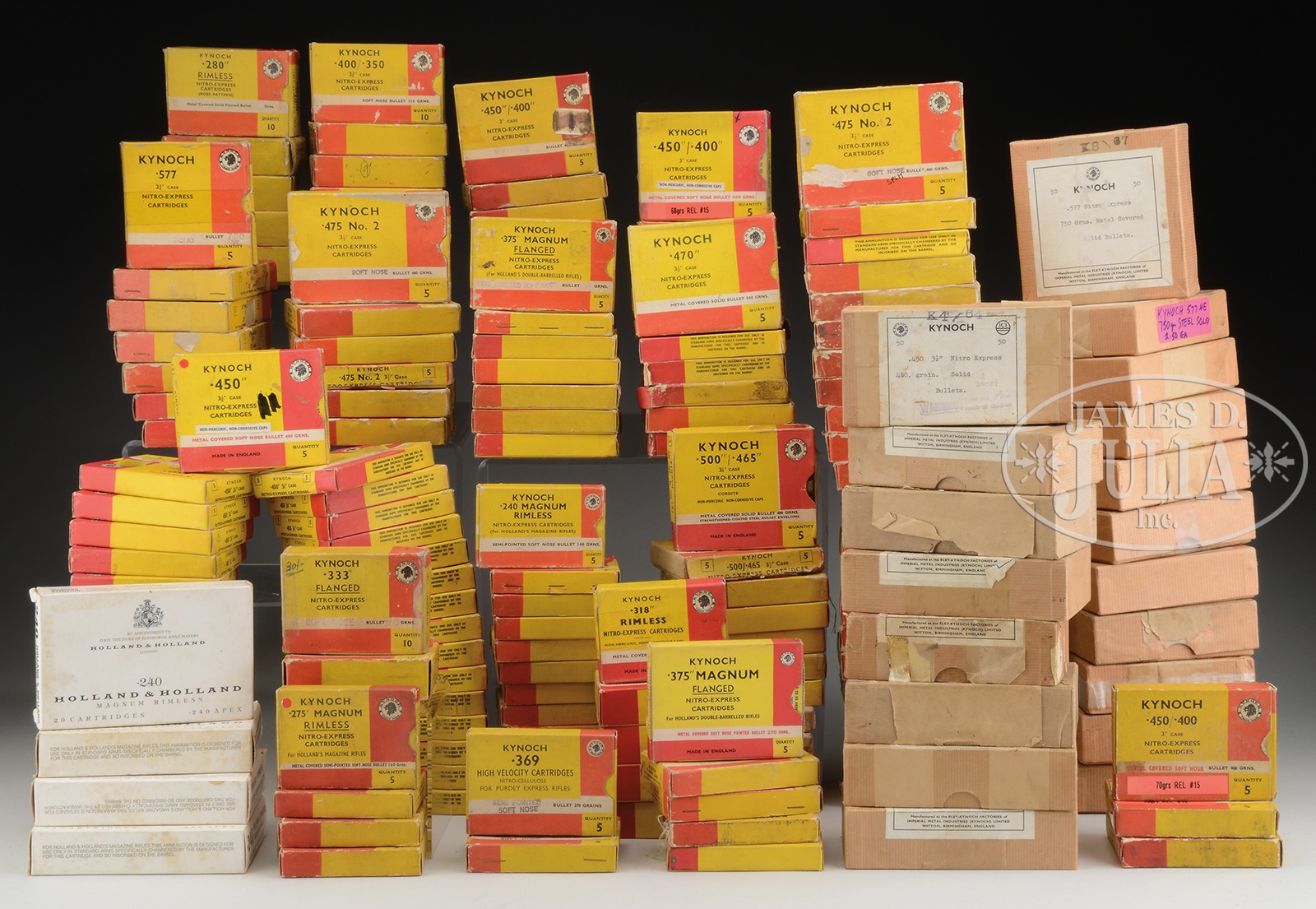 DISCOVERY LOT OF KYNOCH AMMUNITION AND COMPONENTS CONSISTING OF SEVEN PLASTIC TUBS FILLED WITH A VARIETY OF KYNOCH RED AND YELLOW BOXES OF AMMO, AND BROWN LABELED BOXES OF COMPONENTS.SN NSN. Most boxes are full, some are partial: Ammunition consists of over 60 boxes of Kynoch 450 3-1/4 Nitro express, both solid and soft nosed; Six boxes marked “reloads”. Over 25 boxes (some partial) of 475 no. 2 Nitro. 9 Boxes of 470. 11 Boxes 500/ 465. 12 Boxes 375 Magnum flanged, with note “4 Loaded”. 3 Boxes 577 3″. 4 Boxes 577 2-3/4″. 2 Boxes 369 Purdey. 2 Boxes 333 Flanged. 5 Boxes 318 Rimless. 4 Boxes 275 Magnum. 5 Boxes 280 Rimless. 12 boxes 450/400 Nitro 3″. 6 Boxes 400/ 350. Components include: 7 boxes of 50 500 Nitro bullets. Partial box of 450 Nitro. 10 Boxes 450/ 400 3″ Reloads. 4 Boxes 240 Holland brass. 2 partial boxes 500 Nitro steel solid bullets. 3 Boxes 577 Nitro soft nose bullets. 4 boxes 577 Nitro solids. CONDITION: Generally good. Age varies. Some boxes opened, and partial, most not. 50496-9 MGM316 (5,000-8,000) – Lot 3184