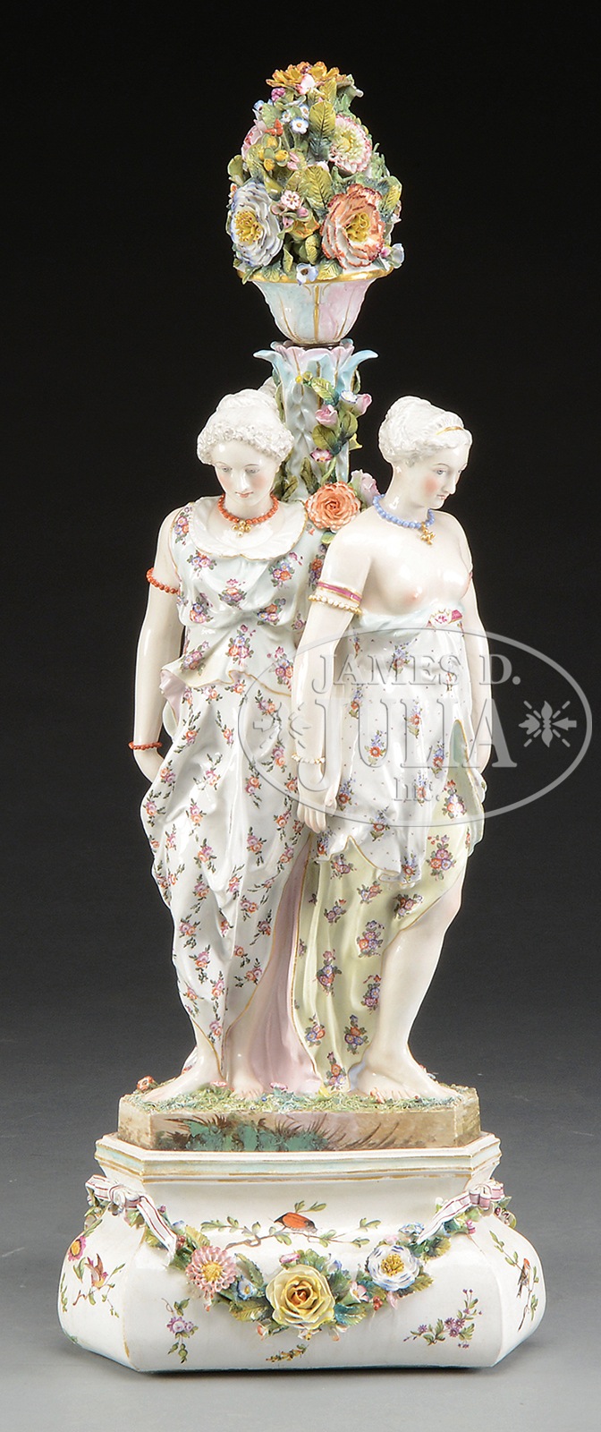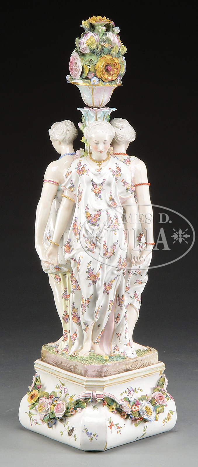 ELABORATE MEISSEN CENTERPIECE.Late 19th early 20th century. Germany. Crossed swords mark in underglaze blue. Centerpiece comprised of three women in polychrome floral robes, each with their back to a floral post surmounted by a floral filled urn, standing on a grassy floral tripartite base attached to a conforming bulbous base decorated overall with ribbon tied floral swags. SIZE: 36″ h CONDITION: Flower heads with losses to edges of petals. Figures in good condition. Wear to areas of gilt decoration. 30548-15 (1,000-2,000) – Lot 3185