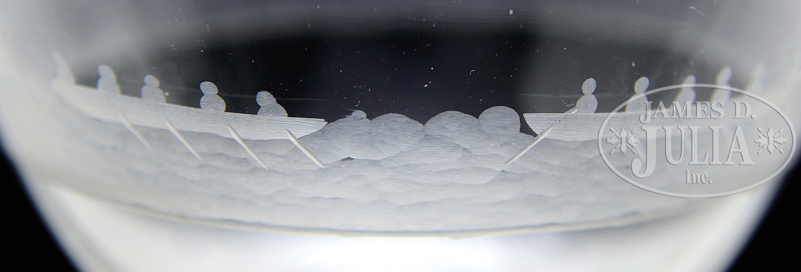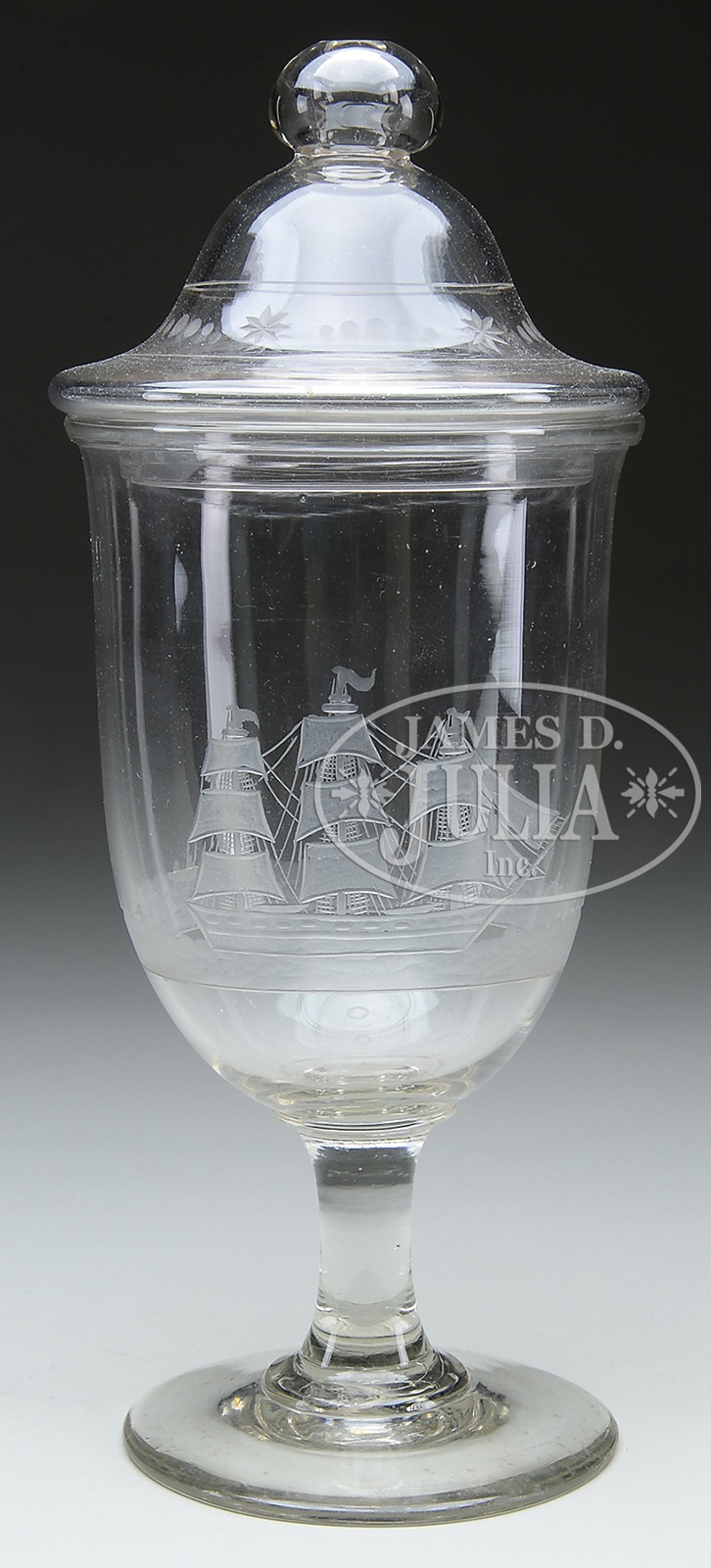EXTRAORDINARY EARLY BLOWN CRYSTAL COVERED POKAL, MID-19TH CENTURY.With exquisite hand engraved whale killing scene featuring 3 masted sailing vessel, multiple long boats with numerous figures and spouted whale all engraved around the sides of the vessel. The lid with a simple ball and star engraved design. Likely a special creation for a whaling captain? SIZE: 15″ h. CONDITION: Very good to excellent 49421-68 (1,500-2,500) – Lot 3186