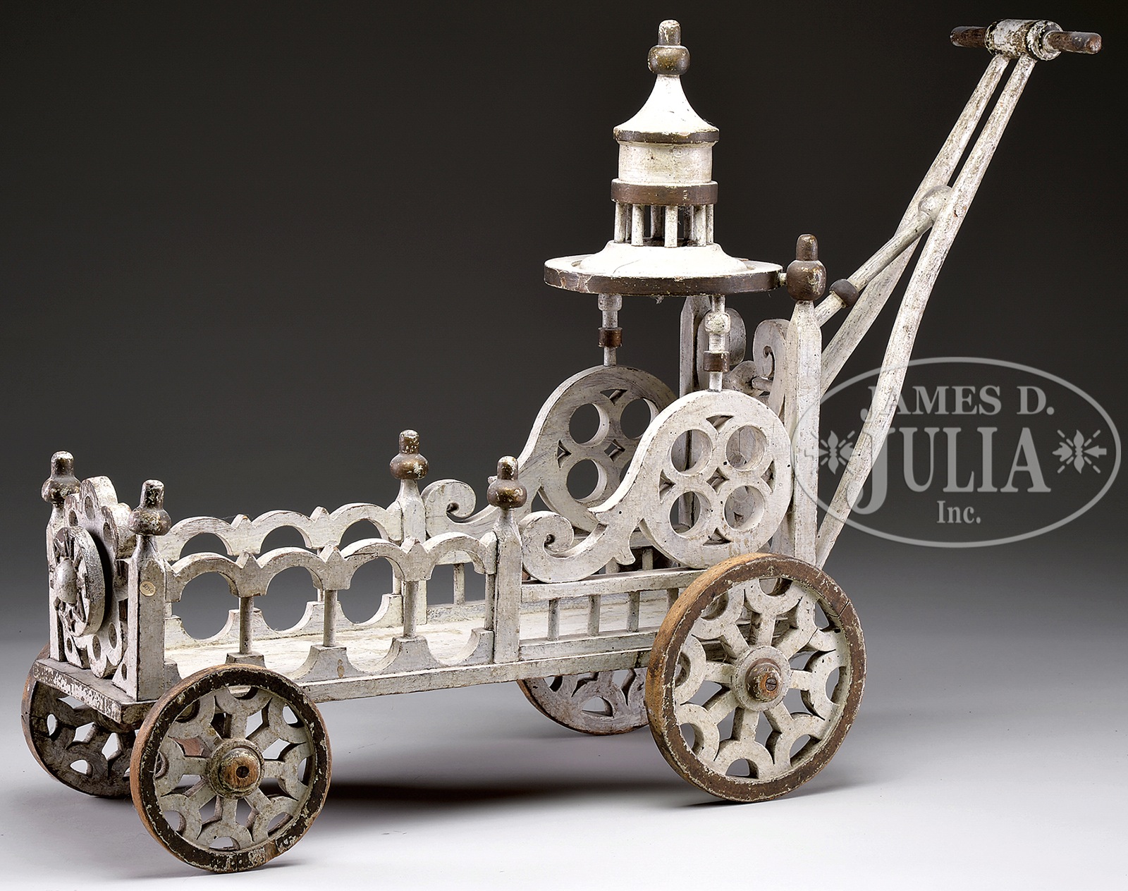 FOLK ART WOODEN CARRIAGE.Unique all wooden doll’s carriage, perhaps made by a father for his daughter. In the front panel is the name “JUANITA” and above where the head of the rider would be is a unique dome or turret-like object. The body of the carriage is painted white with brownish/gold highlights around finials. Maker unknown, age probably late Victorian era. SIZE: 24″ (62cm) t to top of dome x 34″ (87cm) l including handle x 11″ (28cm) w including 2 front wheels. CONDITION: Good with normal age paint loss; wheel with “Juanita” broken off. 1-13900 (900-1,100) – Lot 3187 Auction: Advertising, Toy & Doll - Spring 2014 Please Note: All prices include the hammer price plus the buyer’s premium, which is paid by the buyer as part of the purchase price. The prices noted here after the auction are considered unofficial and do not become official until after the 46th day. |