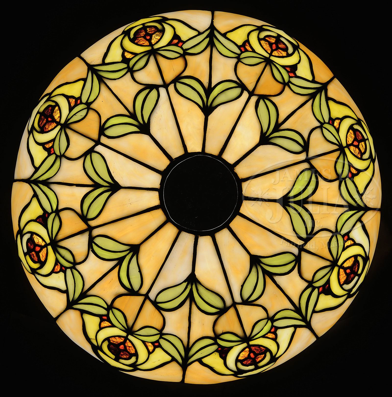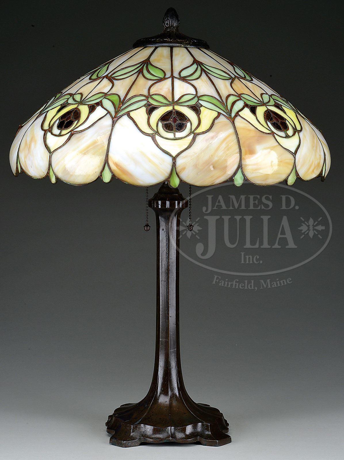 WHALEY LEADED TABLE LAMP.Whaley leaded shade has eight caramel slag panels each containing a large stylized flower and stylized leaves in red, yellow and green glass. The bottom of each caramel background are bent panels creating an irregular border. Unsigned. The shade rests on an original Whaley base with vertically ribbed foot & stem, 2-socket cluster and large open heat cap. Unsigned. SIZE: Shade: 20″ dia. Lamp: 26″ t. CONDITION: Shade is very good to excellent with very few, if any, tight hairlines. Base is very good with some wear and discoloration to patina. The base has a small hole in the side of the foot which has a foundry flaw. Under plate on the base is missing. 5-69373 (2,000-2,500) – Lot 3187