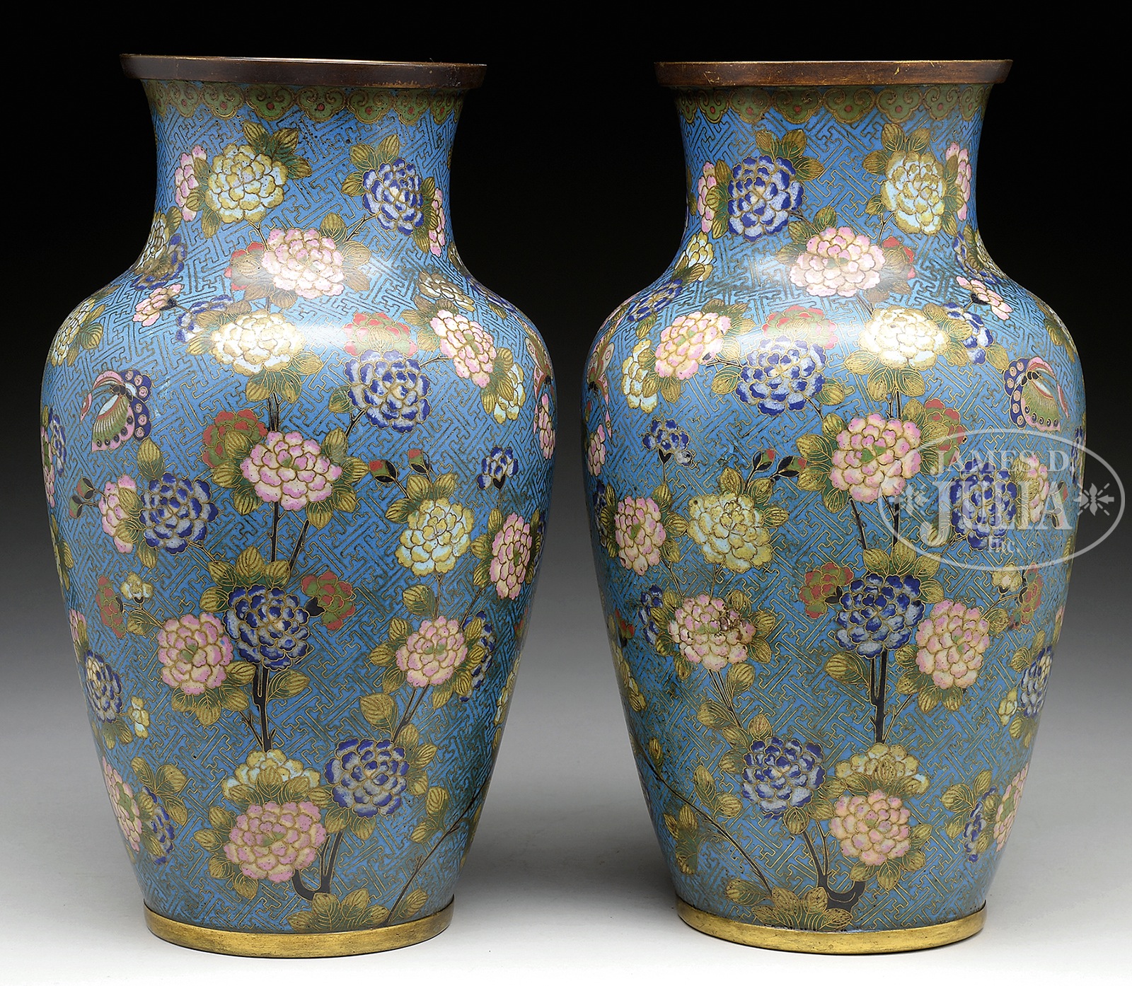 PAIR OF CLOISONNE VASES.China, 19th century. The vases decorated with a colorful display of various blossoms and butterflies on a turquoise enamel ground finished with a diapered pattern executed in gilt wire. The top rims with a ring of ruyi and the undersides having a gilt wash. SIZE: 12″ h. CONDITION: Both vases with minor dents and spots of enamel loss in the body. 49764-1 (4,000-6,000) – Lot 3188