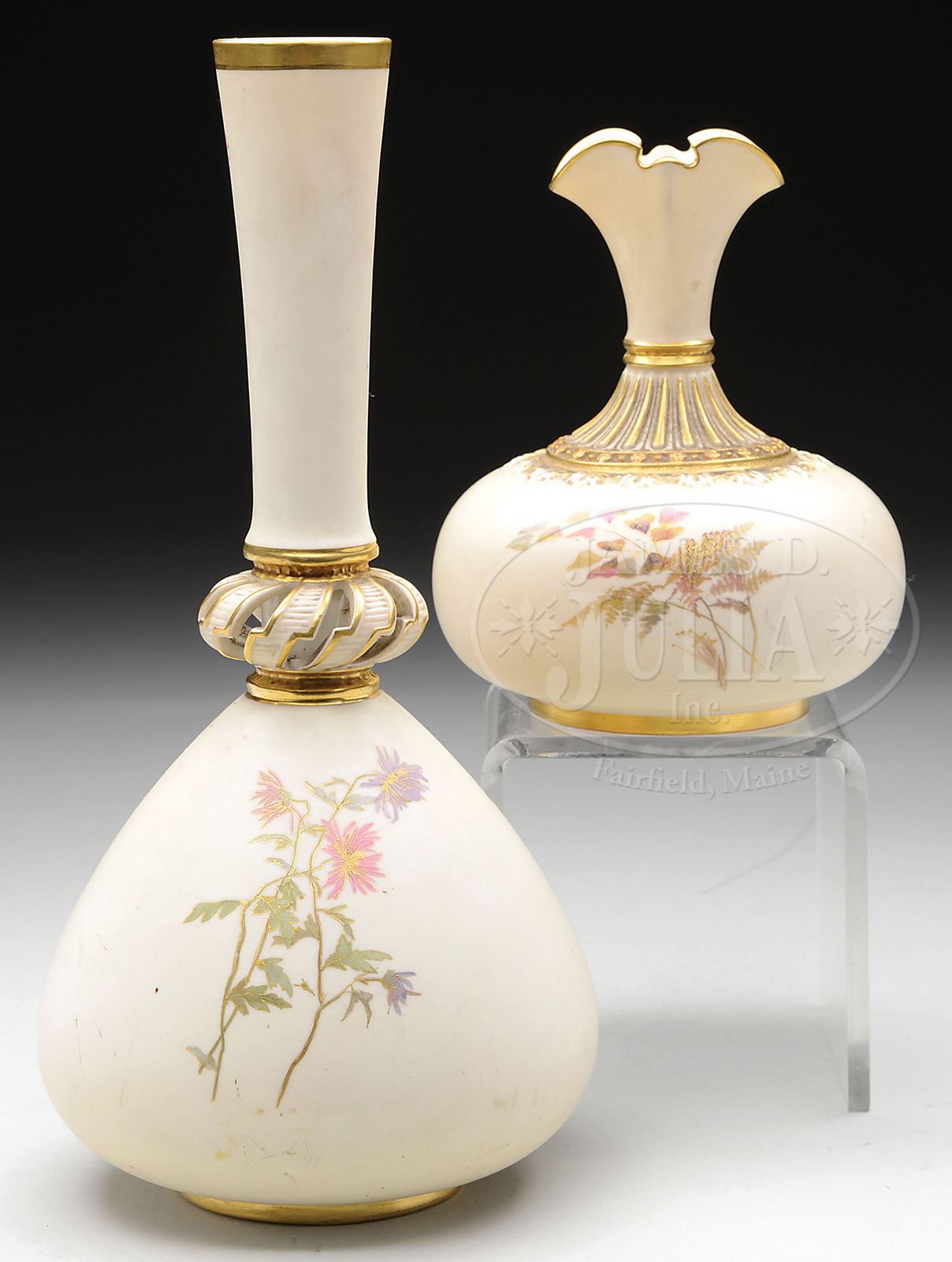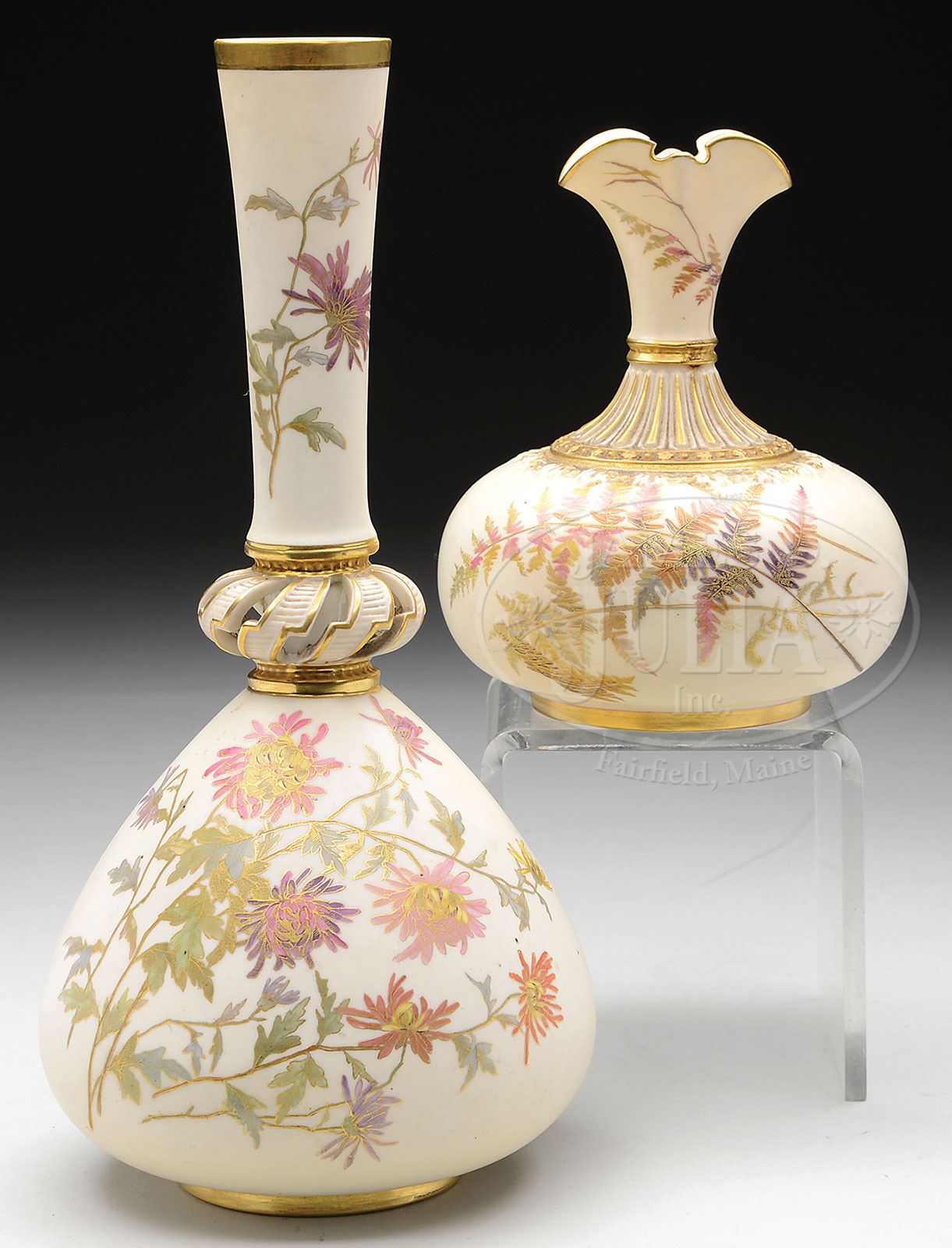 TWO ROYAL WORCESTER GILT DECORATED VASES. Late 19th, early 20th century, England. The first, a tulip bulb example with flared neck, registration No. 43555 and model No. 1136, polychrome decorated with fern leaves and gilt decorated on a matte glaze. The second, a bottle vase with elongated neck and reticulated applied decoration with polychrome chrysanthemum sprays, model No. 1149. SIZE: Smaller: 6″ h. Larger: 11″ h. CONDITION: Each with surface dirt. Larger vase with tight vertical hairline ascending from base rim. 9-26006 (75-125)