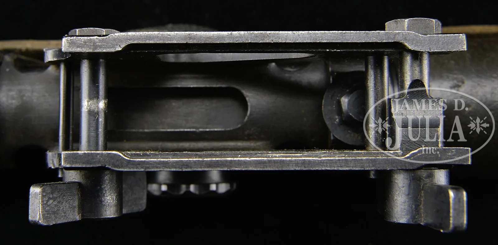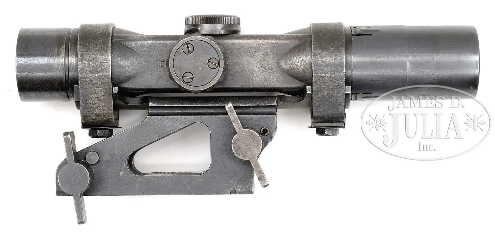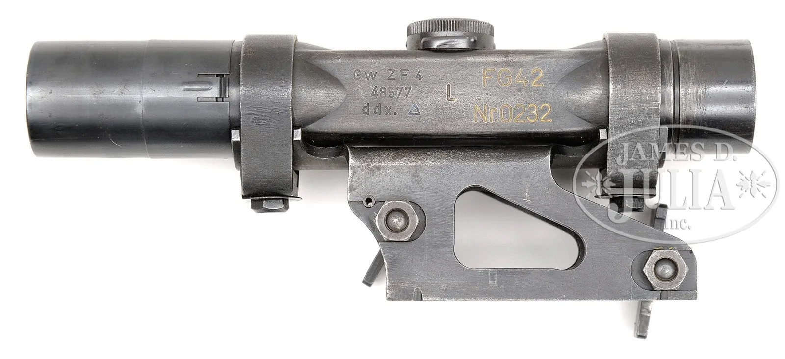 Please Note: Estimate should be $14,000-$20,000 EXCEPTIONAL PURPOSE MADE FG42 SCOPE AND VERY EXCEPTIONALLY RARE PRESSED STEEL DOVETAIL MOUNT.SN 48577. Once in a lifetime opportunity to obtain an example of a rarely found purpose made FG42 scope and pressed dovetail grooved mount (also incorrectly known as a “swallow tail” mount due to mis-translation from the German “Schwalbenschwanz”). The positioning of the clamp screws and small dovetail claws allow this pattern mount only to clamp correctly to the dovetail section receiver rail of the rare “gcy” (L.O.Dietrich/Altenburg) manufactured second pattern FG42, of which only 2 – 300 were made, the cut-outs in the rail of the Krieghoff made guns preventing engagement of the front clamp claws of this pattern mount. This exact set is illustrated on page 243 of Darrein Weaver’s 2001, Hitlers Garands. Scope itself is in very good condition. Marked with the normal “Gw ZF4 48577 ddx”, an additional blue filled triangle and an additional engraved “L”. It is also marked in large engraved letters “FG42 Nr.0232”, which is the SN of the gcy code weapon it was originally mated to. The heavy stamped sheet metal mount itself is also in very good condition, is complete and mechanically sound. The stamped metal retaining bands, spacers and screws are also complete & secure. The set comes with its orig rubber eye piece, stamped sheet metal rain shield & wood, leather, and Presstoff cover. PROVENANCE: Collection of Dr. Geoffrey Sturgess. CONDITION: Very good to excellent overall. Scope retains 95% of orig bluing with wear on the high edges. Some near microscopic scattered pitting in various locations. Optics are clear. Everything functions as it should. Accessories are in excellent condition with tiny dent on rain shield and wooden dowel of cover is missing one small screw. The mount appears contemporary to the scope and is in very good to excellent condition again with tiny scattered pits & blemishes that do not detract. 4-53364 DW36 (14,000-20,000) – Lot 3192