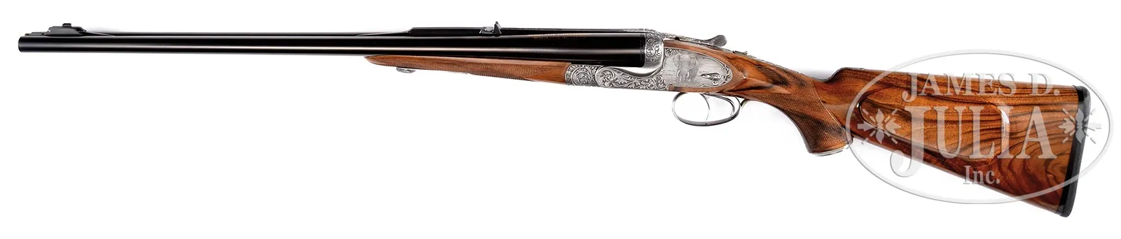 *VERY RARE AND EXCEPTIONALLY FINE FAMARS (ABBIATICO & SALVINELLI) “VENUS EXPRESS EXTRA LUSSO” .470 NITRO EXPRESS SIDELOCK EJECTOR DOUBLE RIFLE WITH FINE RELIEF SCROLL AND BULINO GAME SCENES BY DASSA WITH CASE.SN 1159. Cal. 470 Nitro Express. 24″ Chopper lump bbls fitted with matted quarter rib holding one standing, one folding leaf express rear sight, have matching front ramp fitted with gold bead and Holland & Holland style flip-over ivory night bead. Top rear of right bbl is gold inlaid in Old English script “Famars” “di Abbiatico & Salvinelli” and left side “Safari Club International” “Pittsburg Chapter 1”. Bbl flats are stamped with 1996 Italian nitro proofs, SN and “A&S”, along with “4651”. Coin finished, robust pinless back sidelock action features top tang which extends over comb in H&H style, non-automatic safety (SAFE engraved), hidden third fastener, bushed strikers, reinforced frame, H&H type detachable back locks, and dbl triggers (front articulated). Action is engraved with relief large open scrolling acanthus with stippled shaded background surrounding fine bulino portrait of cape buffalo on bottom under “FAMARS” and “CAL 470 NE” on banners. Left sideplate is engraved with face-on large tusker in open savanna. Right side portrays charging rhino, dust flying, as he exits backdrop of thornbrush. Buffalo and Rhino are both signed “Dassa”, the highly regarded Italian engraving house, with trigger plate also signed. Single beaded trigger guard engraved with matching scroll, has tang which extends to steel trap grip cap. Nicely marbled and somewhat fiddle figured European walnut capped pistol grip buttstock measures 14-1/2″ over thin black Decelerator pad, and features shadow line right hand cheekpiece, and point pattern checkering with line borders at grip. Matching splinter ejector forend has forward pivoting lever bolt release. Drop at heel: approx 2-9/16″, drop at comb: approx 1-13/16″. Cast: Neutral. Weight: 11 lbs. 7 oz. LOP: 14-1/2″. Brown leather case with stitched leather corners, most likely by Nizzoli, is lined in dark green cloth, and has black leather Famars label stitched into lid. Special Note: This item(s) contains plant or animal properties that may be covered by the Endangered Species Act (ESA). We have taken care to ensure that this item(s) meets the standard for sale under the ESA. However, certain states and other countries have laws that are more restrictive than the ESA. It is the bidder’s responsibility to ensure that it is lawful to purchase or transport this item(s) into their state, and to obtain the necessary import and export approvals. Delay or failure to obtain any such permit or approval does not relieve the buyer of paying for the item(s) and consummating the purchase. CONDITION: Excellent, essentially as new, with only the faintest of handling marks in all finishes of wood and metal, most notably a few very light scratches on cheekpiece, appears unfired since proof. Top lever and mechanics are a bit gummy from congealed oil. Case leather has a few light marks and scuffs. Interior cloth has some slight compressions, rubbed through at breech end of bbl channel from contact with third bite. An exceptional high quality dangerous game rifle. 50819-29 MGM178 (35,000-55,000) IVORY – Lot 3193 Click here to view provenance