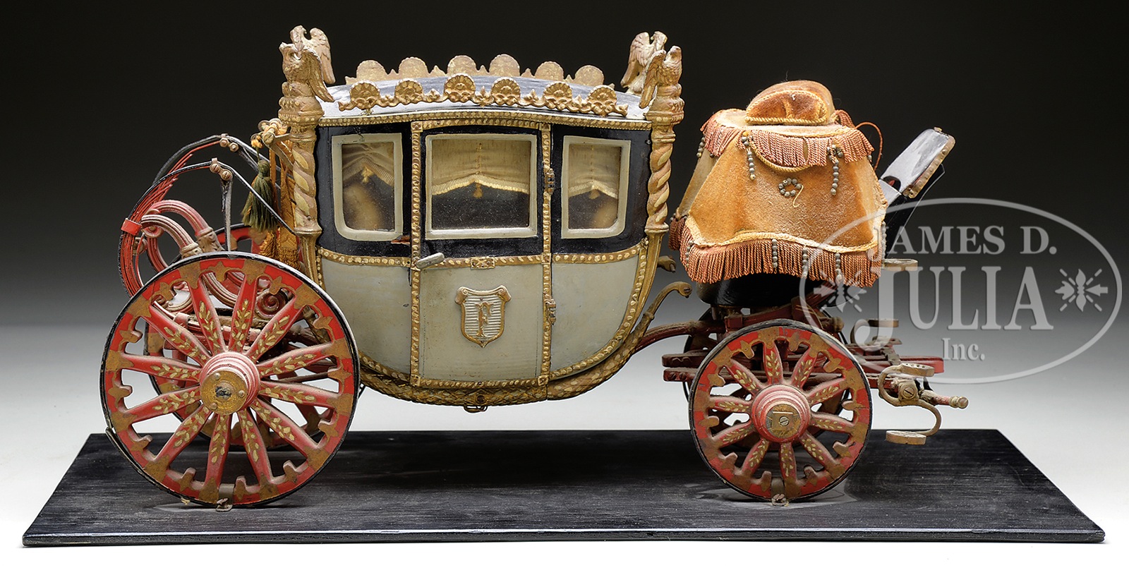 ELABORATE COACH MODEL.Elaborately detailed coach made almost entirely out of wood with platform in back for footman and raised seat in front for the coach driver. On the side is a monogrammed “F” and it is believed that this coach is a miniature made by the Fisher Body Craftman’s Guild, most likely from the 1920s or 1930s. Fisher Body also made real car bodies for Cadillac, etc. SIZE: 10″ t (25cm) x 18″ l (46cm) x 9-1/2″ w (23cm) at widest point. CONDITION: Overall very good with some of the leather trappings broken. Overall very dusty but paint work still good. 1-13659 (400-600) – Lot 3196 Auction: Advertising, Toy & Doll - Spring 2014 Please Note: All prices include the hammer price plus the buyer’s premium, which is paid by the buyer as part of the purchase price. The prices noted here after the auction are considered unofficial and do not become official until after the 46th day. |