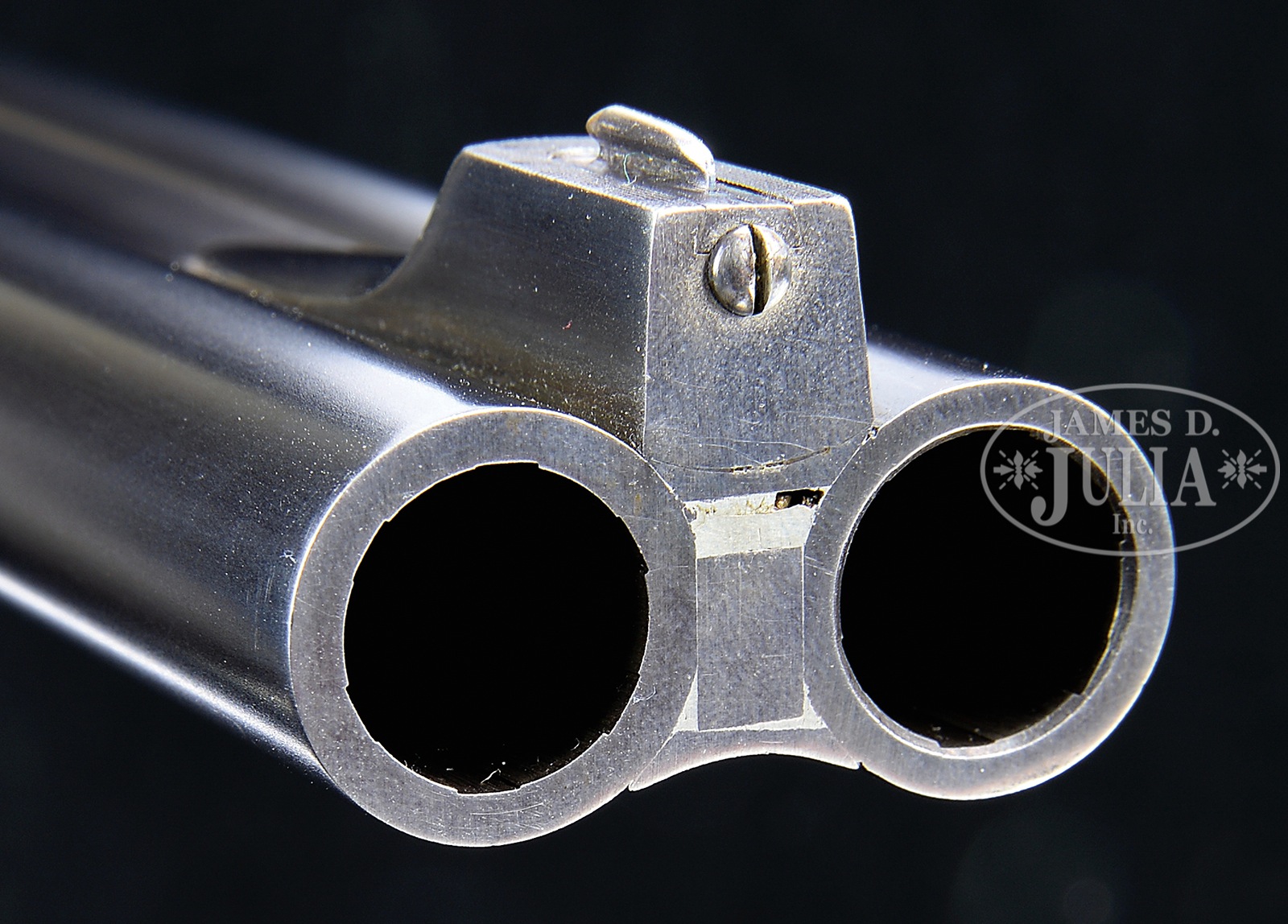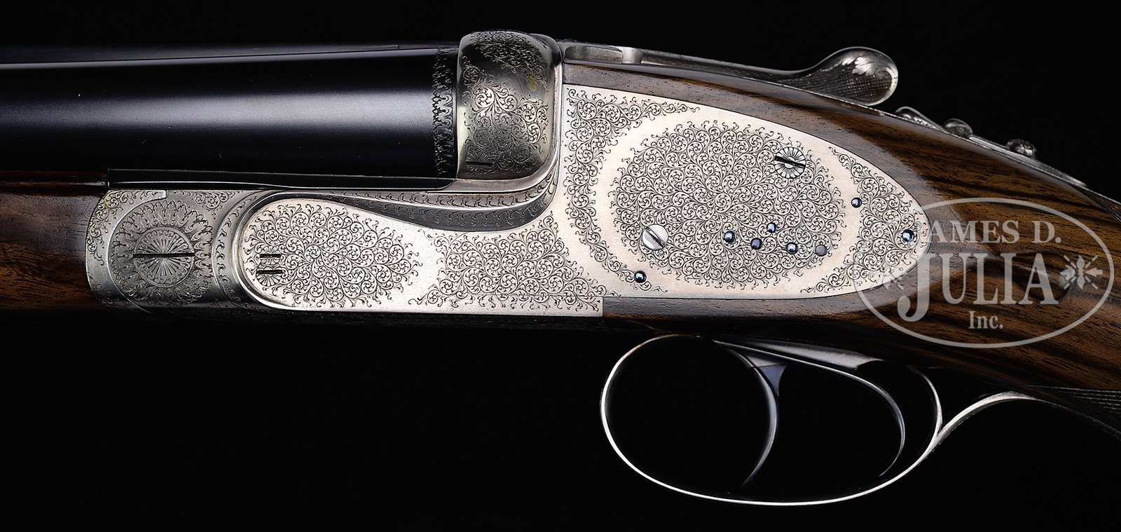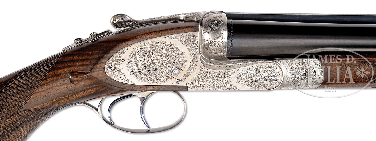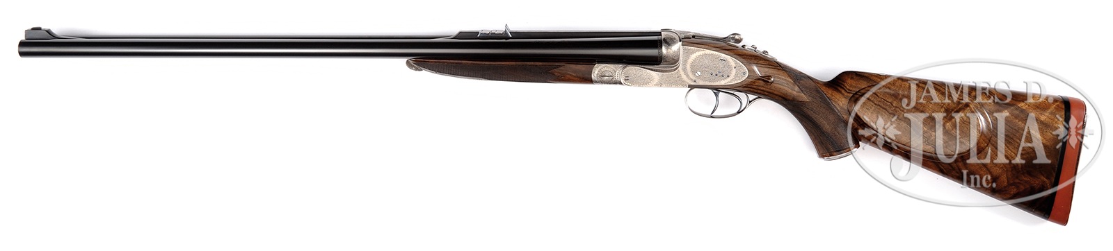 *FINE 577 NITRO EXPRESS SIDELOCK EJECTOR DOUBLE RIFLE BY MARCEL THYS.SN 079. Cal. 577 Nitro Express. 26-1/4″ Chopper lump bbls are fitted with raised, matted, quarter rib holding one standing, two folding leaf express rear sight, and short front ramp holding silver bead. “M. Thys Liege Belgium” is engraved on top of left bbl. Bbl flats are engraved “750 gr. Bullet Weight”. Bottoms of bbls are stamped with Belgian nitro proofs for 577 Nitro 3″. Robust, coin finished, sidelock action has top strap which extends over comb in H&H fashion, and features non-automatic safety with pivoting bolt, hidden third fastener, bushed strikers, slight reinforce to action, raised rib tumbler end cocking indicators, and dbl triggers (front articulated). Action and lockplates are engraved with 80% coverage well cut classic small scroll. Engravers signature “Ligma” is on trigger plate. Matching steel trigger guard has tang which extends to steel trap grip cap. Fine streaky marbled and flame stump figured European walnut steel capped pistol grip buttstock measures 15″ over leather faced Silver type pad, and features large shadow line right hand cheekpiece, deep carved drop points, and closely spaced point pattern checkering with line borders at grip. Matching full splinter ejector forend has forward pivoting bolt release. Drop at heel: approx 3-3/16″, drop at comb: approx 1-15/16″. Cast: Neutral. Weight: 12 lbs. 0 oz. LOP: 15″. CONDITION: Excellent, very close to new, with little evidence of having been fired since proof, and retaining nearly all of its factory finishes on wood and metal; with only a few very minor handling and assembly marks. Bores show a bit of metal fouling in grooves. Action is tight. Bbls are on face. Ejectors are strong and in time. A well made dangerous game rifle. 50655-9 MGM147 (25,000-35,000) – Lot 3196