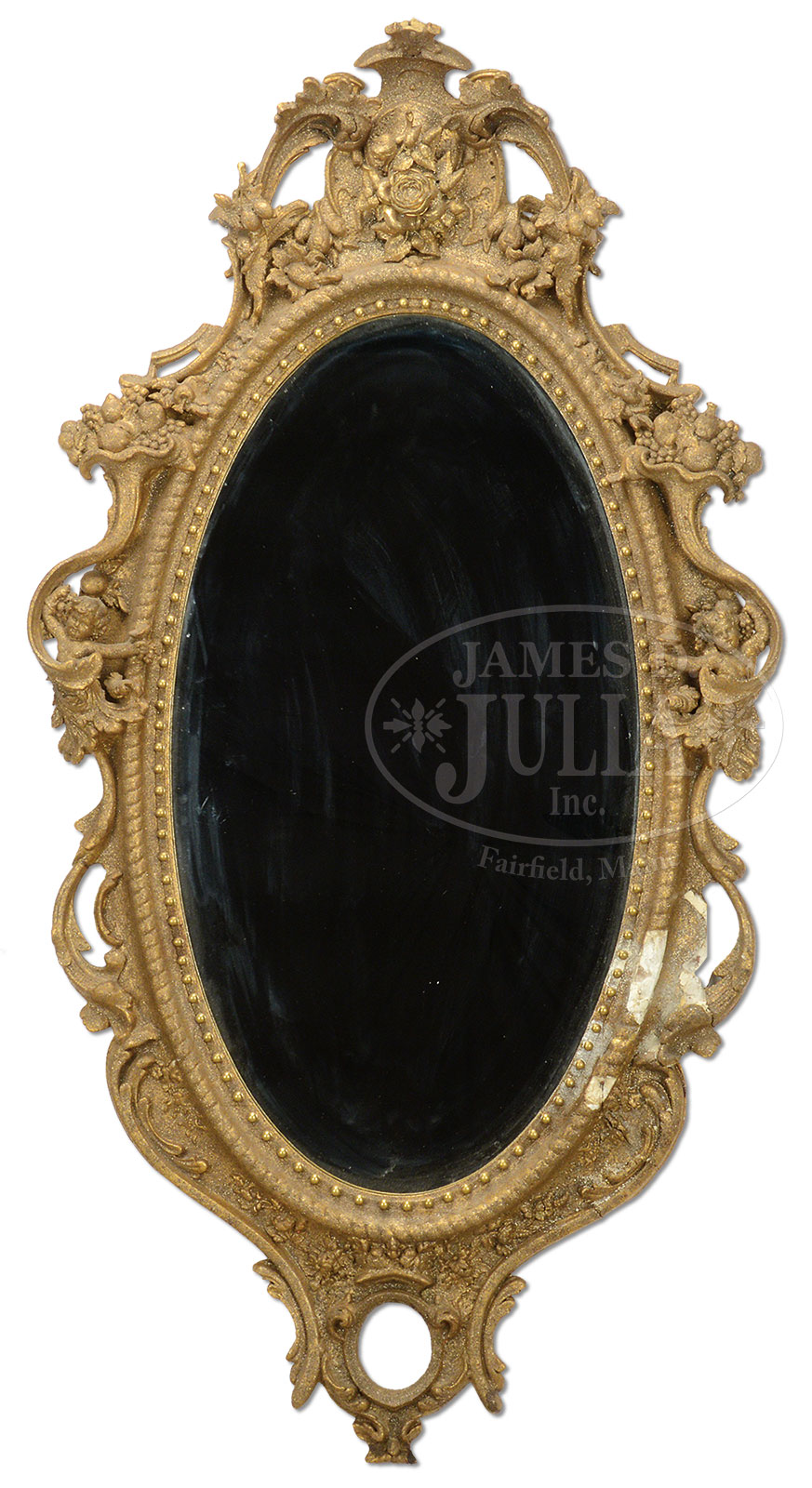 ELABORATE VICTORIAN ERA GESSO MIRROR.Circa mid-19th century. This impressive mirror is mounted on top with a huge collage of elaborate flowers and fruits. The upper sides of the mirror ornamented with cornucopias spilling fruit being held by a frolicking putti. The entire surface is an old gold finish with a sand surface. SIZE: 70″ high x approximately 36-1/2″ wide. CONDITION: Damage and loss to the lower right edge of the frame. Also a small loss at the very top. 52380-9 (400-600) – Lot 3198
