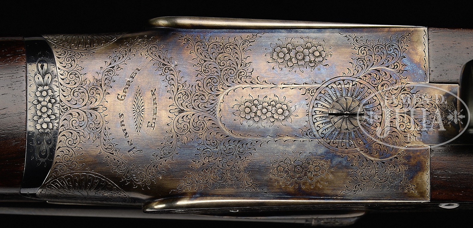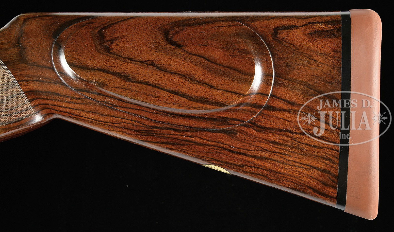 *THE FIRST GARBI DOUBLE RIFLE, A SIDELOCK EJECTOR IN 375 H&H WITH CASE.SN GA27-06-001-96. Cal. 375 H&H. 25″ Chopper lump bbls are fitted with matted quarter rib holding single standing leaf express rear sight. Transition to mid rib has foliate engraving, as does ramp to silver bead front sight. Tops of bbls are engraved “ARMAS GARBI SPAIN” and “WILLIAM LARKIN MOORE & CO WESTLAKE VILLAGE, CA NO. 1”. Bbl flats are stamped with SN, Spanish proofs, and caliber. Ejectors are fitted with spring loaded detents for rimless case. Case hardened sidelock action with reinforcing bolsters, features automatic safety (S inlaid in gold), bushed strikers, and dbl triggers (front articulated). Action is engraved in classic Purdey inspired rose and scroll with makers name on bottom. Beaded trigger guard has scroll on bow and last portion of SN on tang. Nicely marbled, dense, European walnut pistol grip buttstock measures 14-1/2″ over brown Decelerator pad, and features elongated drop points, point pattern checkering with dbl line border at grip, and gold oval engraved “W L M” on toe line. Matching long splinter ejector forend has Anson release. Wood in bbl channel is stamped “001”. Drop at heel: approx 2-1/4″, drop at comb: approx 1-9/16″. Cast: approx 1/2″ off. Weight: 8 lbs. 9 oz. LOP: 14-1/2″. Tan leather case with stitched leather corners is lined in burgundy felt and has embroidered Garbi label on lid. Case holds exterior case straps. PROVENANCE: Remarkable William Larkin Moore Private Estate Collection of Fine Sporting Arms. CONDITION: Excellent, essentially as new, with only a few light handling and assembly marks, most notably a small double ding on cheekpiece. Mechanically crisp. Case is excellent. A well balanced, fine handling, double rifle in what most regard as the finest all around caliber ever. 50594-87 MGM54 (22,500-37,500) – Lot 3199