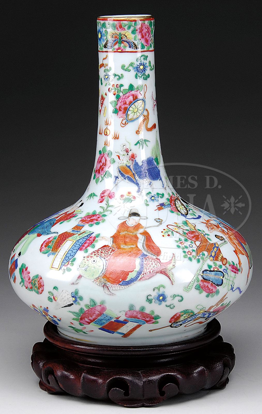 ROSE MANDARIN BOTTLE VASE. Chinese, mid 19th century. Nicely decorated overall with figures of immortals riding mythical animals alternating with scholarly devices. Neck with floral, butterfly and bat decorations. SIZE: 11-1/2″ h x 7-1/2″ dia. PROVENANCE: From a fine Kennebunkport, Maine home. CONDITION: Very good. 9-24302 (1,500-1,800)