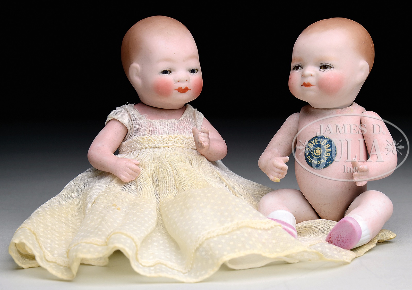 TWO ALL-BISQUE BYE-LO’S.Charming pair of all-bisque baby dolls with brown glass sleep eyes, swivel necks, 5-piece all-bisque bodies, one with molded and painted blue shoes and socks, and the other with molded and painted pink booties and white socks. Both have their original paper stickers on front torso and both are incised on the backs of the torsos “6-13 Copr By Grace S. Putnam”. SIZE: 5″ t (13cm) each. CONDITION: Overall very good; doll with pink booties appears to have a slight restoration to one right finger. 1-14070 (400-600) – Lot 3200 Auction: Advertising, Toy & Doll - Spring 2014 Please Note: All prices include the hammer price plus the buyer’s premium, which is paid by the buyer as part of the purchase price. The prices noted here after the auction are considered unofficial and do not become official until after the 46th day. |