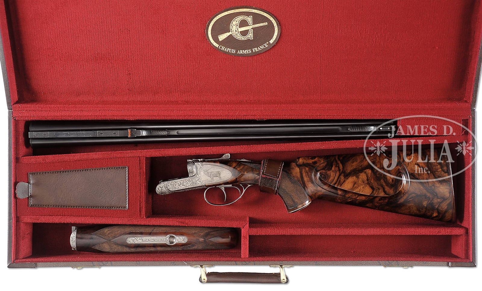 *CHAPUIS ARMES “IMPERIAL EXPRESS” SIDEPLATED BOXLOCK DOUBLE RIFLE WITH FINE SCROLL AND BULINO ENGRAVING BY DASSA WITH CASE.SN 37711. Cal. 30-06. 23-5/8″ Bbls with unique to Chapuis shoe lump double hook construction, are fitted with matted quarter rib holding single standing leaf rear sight engraved “Carabine Double Express” “Chapuis Armes France”. Transition to mid rib has foliate engraving, as does front ramp which holds white bead adjustable for elevation. Extractors are fitted with spring plungers to engage rimless case. Coin finished, sideplated, boxlock action features non-automatic safety, bushed strikers, and dbl triggers. Action is engraved with near full coverage well cut semi-relief open shaded acanthus scroll surrounding Bulino vignette of a pronghorn antelope on bottom. Left sideplate tail depicts a roaring elk, and a large mule deer is on right. Trigger plate is signed “Dassa”. Wonderfully burl figured and marbled European walnut steel capped pistol grip buttstock measures 15″ over checkered wood buttplate, and features a large shadow line right hand cheekpiece, nicely engraved grip cap, and point pattern checkering with line borders. A matching beavertail forend has Deeley type release. Drop at heel: approx 2-7/8″, drop at comb: approx 1-5/8″. Cast: approx 1/4″ off. Weight: 7 lbs. 12 oz. LOP: 15″. Makers vinyl covered case with leather trim is lined in red waled cloth, and has Chapuis label in lid. Case contains proof certificate, guarantee cards, and test target. PROVENANCE: Remarkable William Larkin Moore Private Estate Collection of Fine Sporting Arms. CONDITION: Excellent, nearly as new with only a few light handling and assembly marks in all factory finishes, most notably some light scratches and marks at left side buttstock near toe. Breech area of bbls show some slight discoloration. Mechanically crisp. Case is excellent. 50594-98 MGM62 (9,500-15,000) – Lot 3200