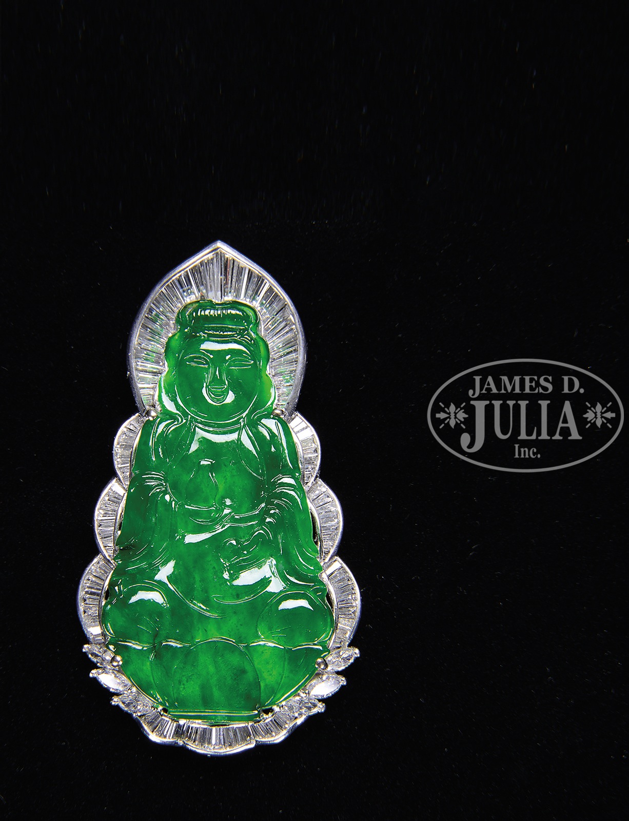 NATURAL JADEITE GUAN YIN AND DIAMOND PENDANT.The jadeite carved as Guan Yin, surrounded by brilliant-cut diamonds. Accompanied by GIA certificate stating that the jadeite is natural, known in the trade as “A jade”. SIZE: Guan-Yin approximately 51.97 x 27.72 x 1.81 mm. CONDITION: Very good. 9-97184 (52,500-57,500) – Lot 3201