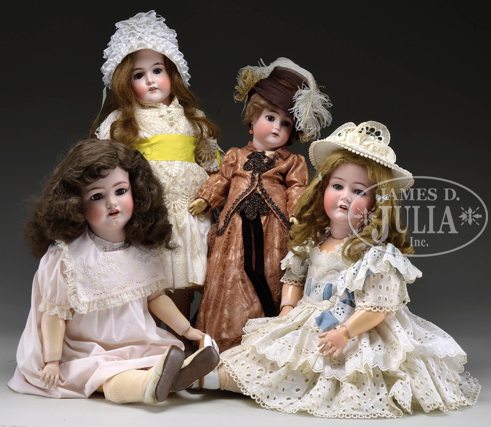 FOUR LARGE GERMAN BISQUE HEAD DOLLS.Largest is incised “S&C Simon & Halbig 80” with brown glass sleep eyes on fully jointed body. Next largest is incised “Cuno & Otto Dressel” with blue glass sleep eyes and is on a fully jointed body, missing one finger. Another doll incised “Queen Louise” with blue glass sleep eyes and painted lower lashes and silk upper lashes. Smallest is incised “K*R 62″ with brown glass sleep eyes on original body. SIZE: Largest: 31″ t (80cm). Smallest: 24” t (62cm). CONDITION: Good; all have some typical body wear; Queen Louise has a few white spots on forehead that are not wig pulls. 1-13695 (800-1,000) – Lot 3206 Auction: Advertising, Toy & Doll - Spring 2014 Please Note: All prices include the hammer price plus the buyer’s premium, which is paid by the buyer as part of the purchase price. The prices noted here after the auction are considered unofficial and do not become official until after the 46th day. |