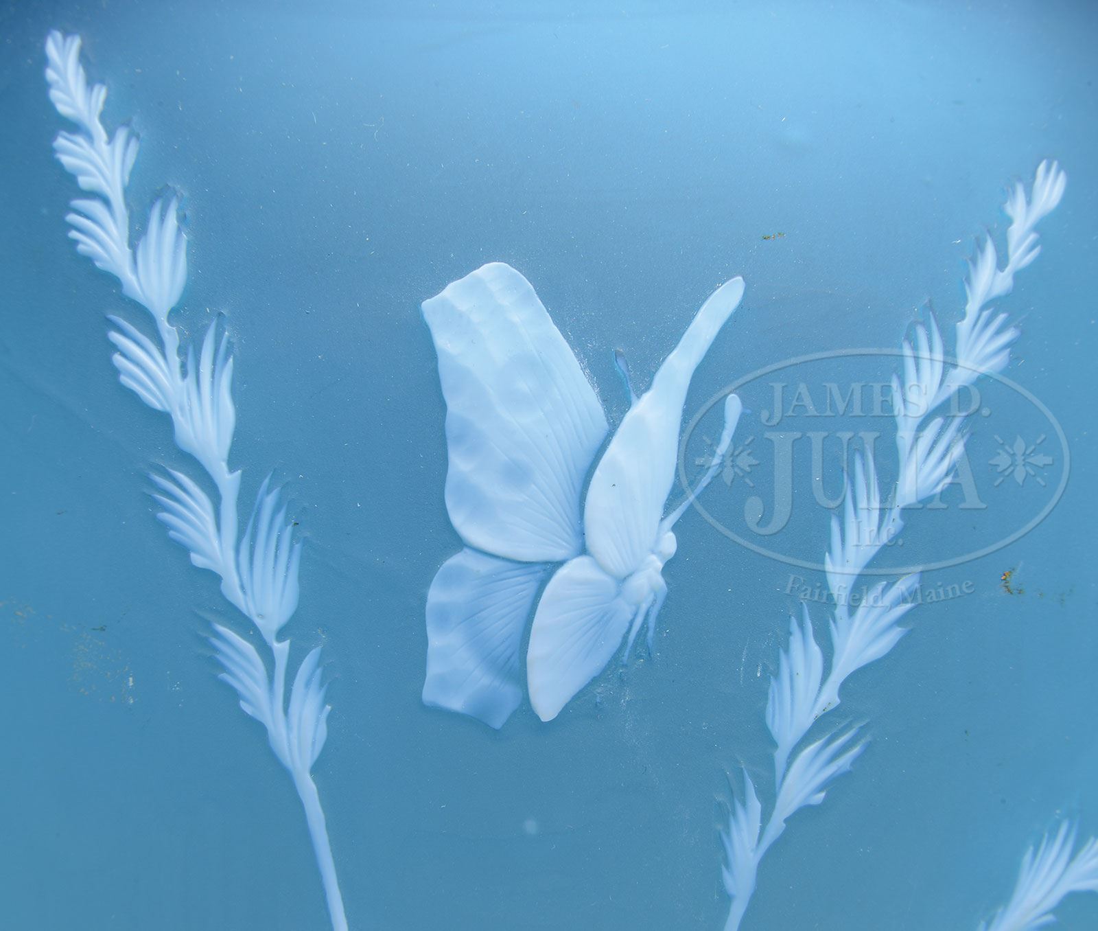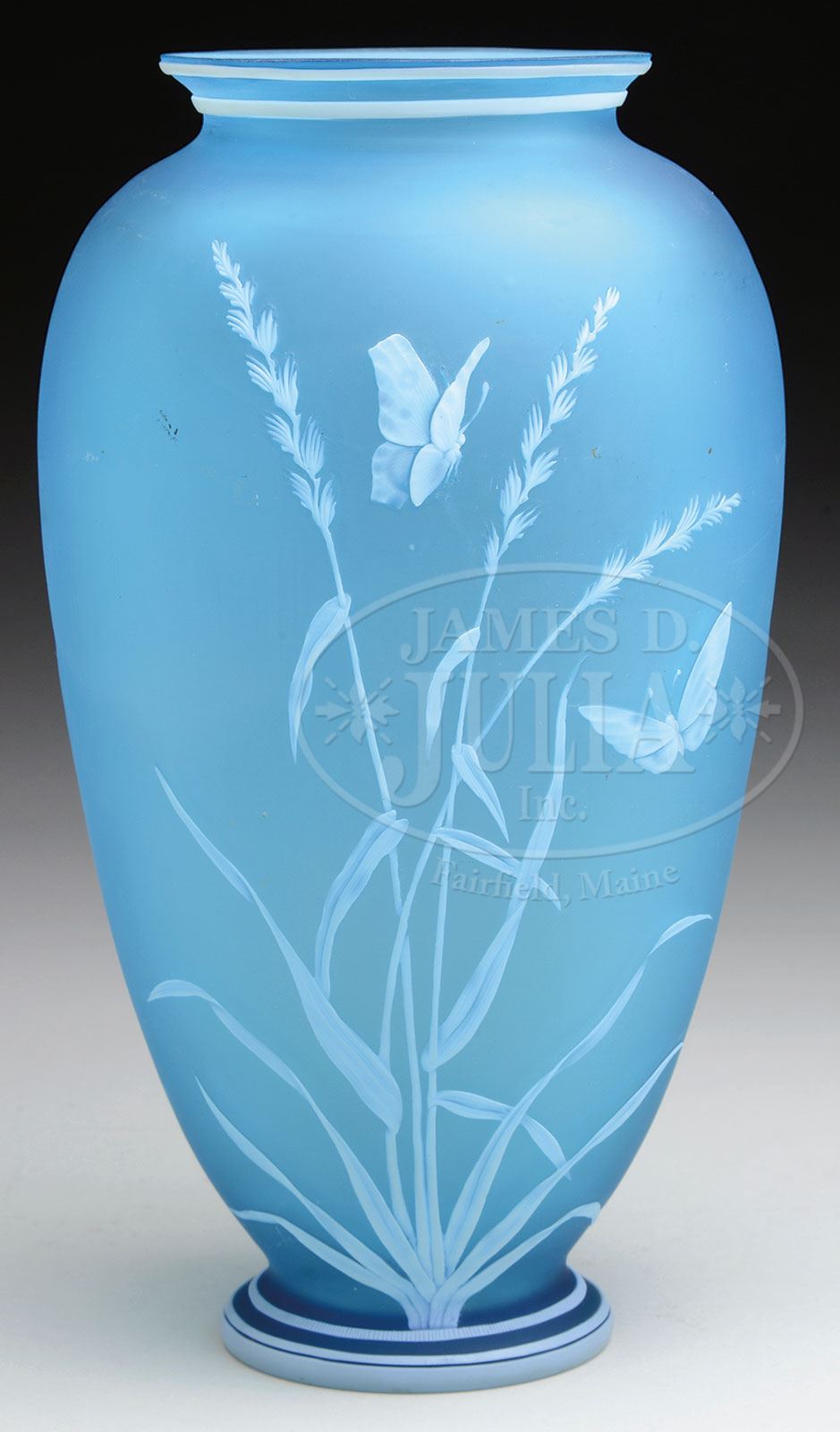 THOMAS WEBB & SONS CAMEO FLORAL VASE.Pale blue baluster form vase has white cameo decoration of flowers, stems and leaves with two honeybees on the front and two butterflies on the reverse. Vase is finished with a double cameo band on the rim and triple band on the foot. Signed on the underside “Thomas Webb & Sons Gem Cameo” acid etched logo. SIZE: 9-1/4″ t. CONDITION: There are minor inclusions in the glass and one tiny open bubble just above the foot, all from the making. Otherwise very good to excellent. 5-60136 (1,500-2,500) – Lot 3206