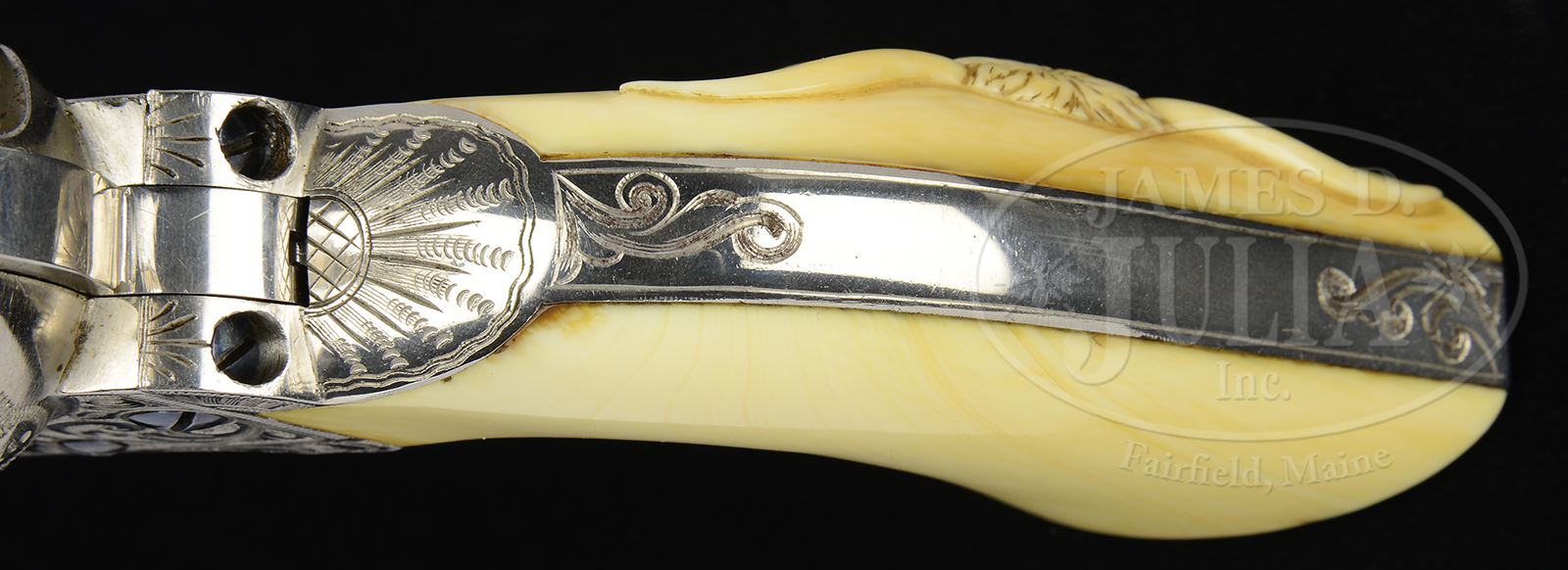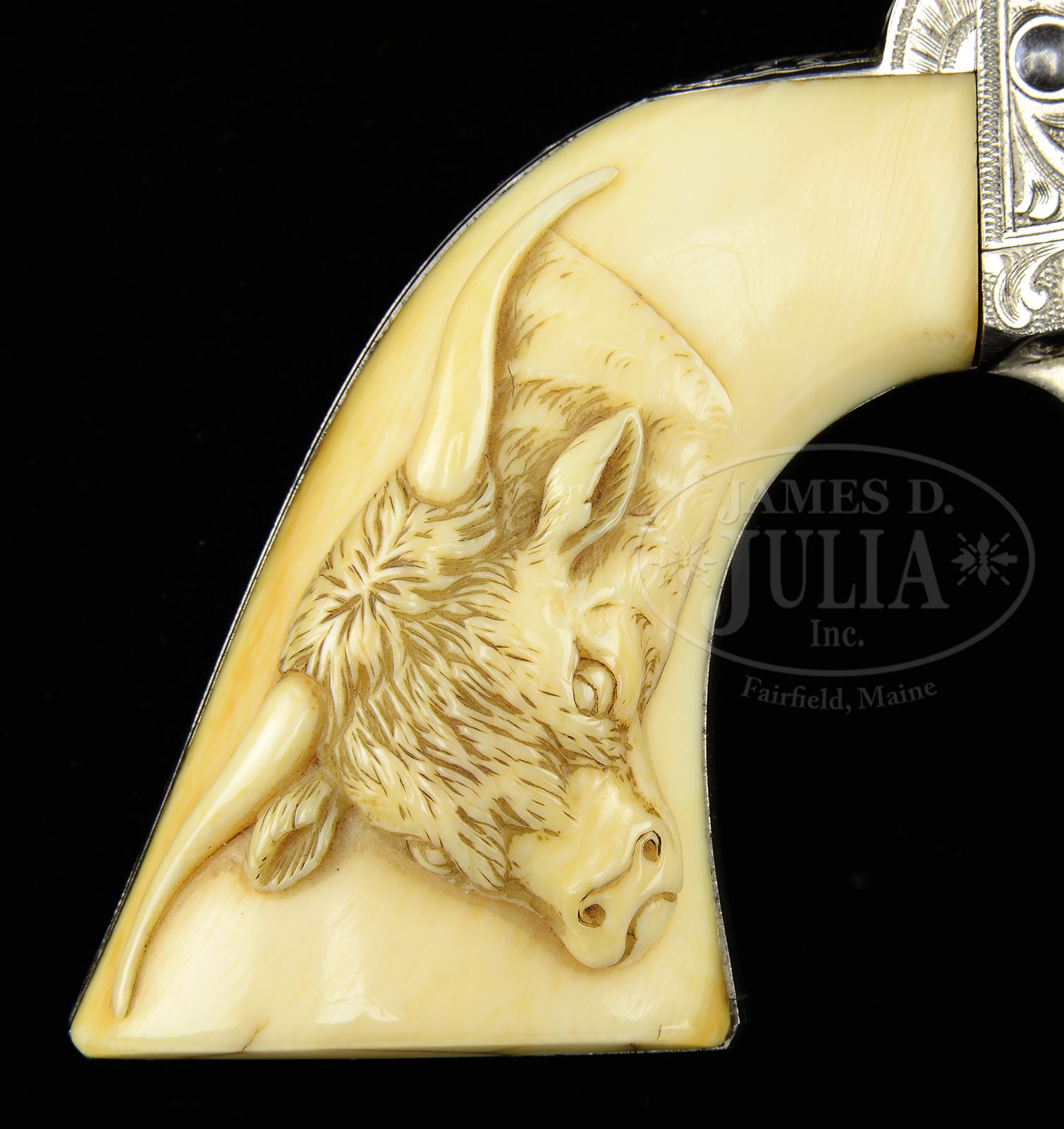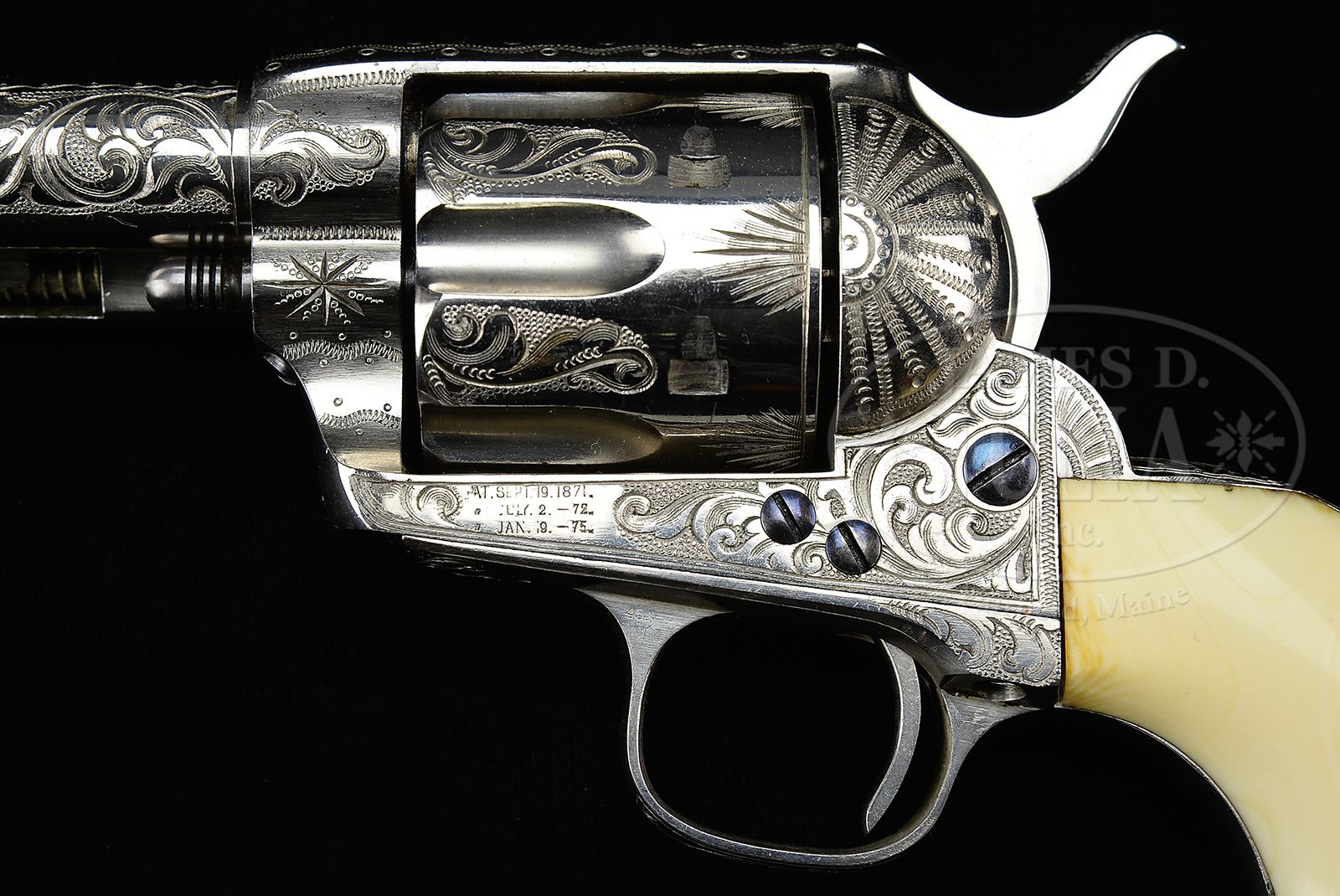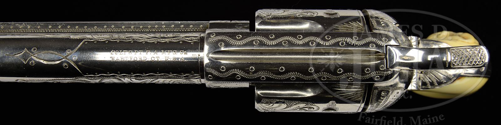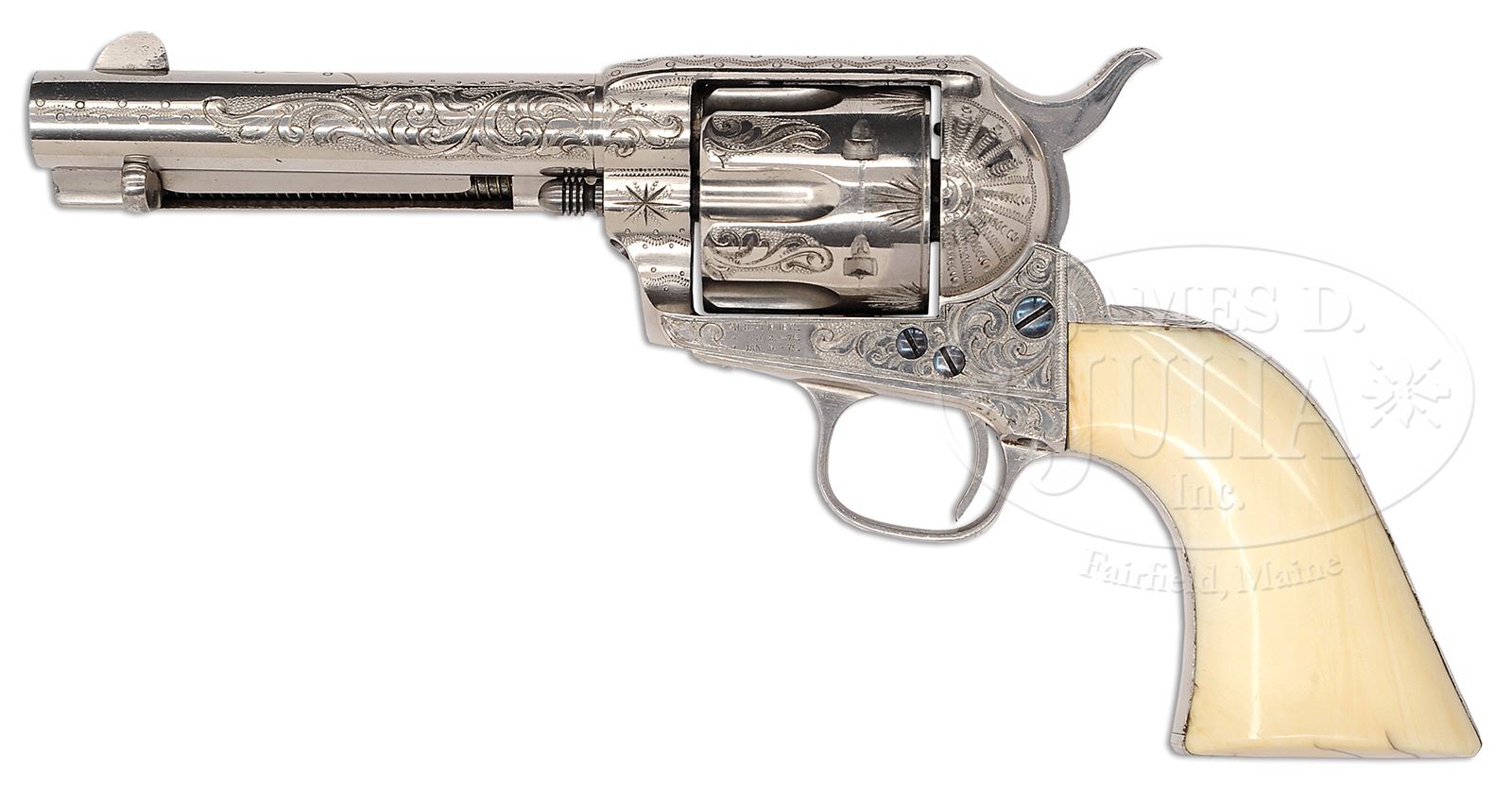 Please Note: As cataloged this beautiful Colt is factory engraved and is certainly Nimschke shop engraving. Please note, L.D. Nimschke was an extraordinary, gifted engraver but Colts that were engraved in his shop were not all personally engraved by him. The gifted engravers that worked for him executed a large quantity of engraved Colts that came out of his shop. Some Colt collectors have stated that they felt this Nimschke Colt was not engraved by Nimschke personally and we do not disagree. None the less it was produced in his shop. EXCEPTIONAL EARLY NIMSCHKE ENGRAVED COLT SINGLE ACTION ARMY REVOLVER.SN 103901. Cal. 45. Nickel finish with 4-3/4″ bbl, full front sight & 2-line address. Frame has 3-line patent dates & left front web of trigger guard is marked with Cal. Mounted with distributor supplied 1-pc “certifiable antique ivory” grip that has an extraordinary, very deep, raised carved ox head on right side. Grip is constructed in early style consisting of 2 slabs of ivory attached to 2 wooden spacer blocks and has the matching SN in the backstrap channel. Ejector housing is third type with half-moon ejector head & bottom of bbl has last 4 digits of matching SN under ejector housing. Revolver is beautifully engraved by L.D. Nimschke with nearly full coverage foliate arabesque patterns on the frame. Left recoil shield and loading gate have Mr. Nimschke’s distinctive sunburst patterns. Topstrap is engraved in his snake & dot patterns with fine snake & dot patterns in the bottom front gullets. Base pin boss & ejector boss are engraved with hunter’s stars. Matching engraving extends about 3/4s up the sides of the bbl with snake & dot patterns continuing to the muzzle. The address has fine snake & dot & geometric patterns around the address, extending nearly to the front sight. Cylinder is engraved with matching foliate arabesque patterns on lands between flutes with sunburst patterns back of the flutes. Rear face of cylinder is marked with last 4 digits of of matching SN. Top gullet of ejector housing is engraved with very fine zig-zag & dot patterns. Outer radius of ejector housing is engraved in geometric patterns. top of backstrap & backstrap ears are engraved in distinctive Nimschke patterns with foliate arabesque & geometric patterns down the backstrap, on the buttstrap & trigger bow. Screw heads are all fire blued and all engraving patterns have pearled background. Cylinder pin is a later replacement. Accompanied by a Colt factory letter which identifies this revolver in Cal. 45 Colt with 4-3/4″ bbl, nickel finish, type stocks not listed, factory engraved & shipped to Schoverling, Daly & Gales, NY, NY on Oct 1, 1884 in a 3-gun shipment. Additionally accompanied by a modern custom made, red velvet lined oak casing that is compartmented for the revolver with a covered compartment containing a functioning key with a cartridge block containing 18 rounds of modern ammunition. PROVENANCE: The Estate Collection of Phil A. Bleakney, Jr. Special Note: This item contains or is made of ivory. Do not bid on this lot unless you have read and agreed to our "Ivory Position Statement" and the "Waiver of Legal and Financial Risk to James D. Julia in regards to your Purchase of an Ivory Object." This information is located in the front section of our catalog. CONDITION: Extremely fine, all matching including bbl, cylinder and grip. Overall retains 98-99% crisp orig nickel showing only minor dulling near the muzzle. Screws retain about all of their orig fire blue. Grip is sound & has minor age lines on the bottom edges & overall shows a wonderful, mellow ivory patina. Hammer is not solid & safety notch, otherwise mechanics are fine, bright shiny bore with a couple scattered spots of pitting. Box is extremely fine. 49059-86 JR IVORY (40,000-60,000) – Lot 3207 | Click here to view provenance