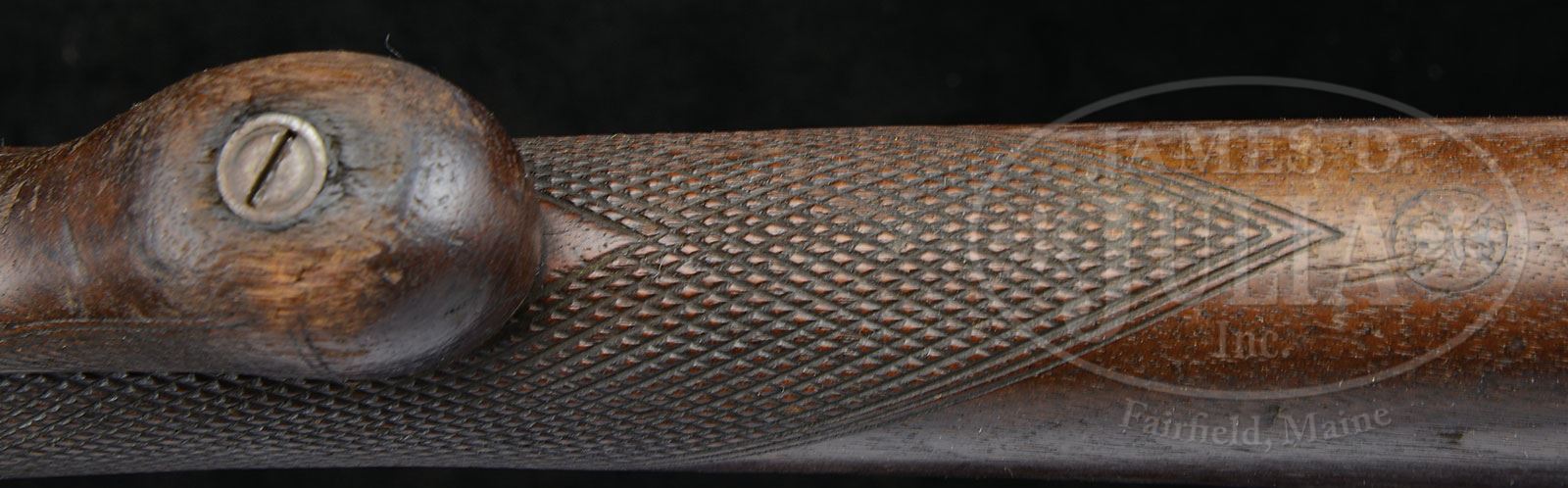 RARE AND HISTORIC SPRINGFIELD OFFICERS MODEL 1875 TYPE II RIFLE USED IN DAKOTA TERRITORY.SN NSN. 45-70 Cal. Second type officer’s model with 26″ rnd bbl. Hooded adjustable front sight and ladder type rear sight. The low arch breech block has the 1873 markings and the lock plate is marked “U.S. / SPRINGFIELD” forward of a spread winged American eagle. Mounted in a 1-pc walnut half stock with checkered forearm & straight stock that has musket/carbine buttplate without trap and has detachable checkered pistol grip. Forearm has a pewter tip in foliate pattern & forearm is secured by a single band with band spring. Top of the wrist is mounted with tang sight with oval base. Trigger is single-set style. Lock plate, hammer, breech block, thumb lever, trigger guard, front receiver ring, bbl band, forend cap & buttplate tang are very nicely engraved in flowing foliate arabesque forms typical of this pattern. Bbl has the standard “VP” and eagle head proofs & the buttplate tang is marked “US”. Bottom of the bbl has a single iron guide which contains a hickory and silver plated brass cleaning rod. According to Flayderman’s Guide to Antique American Firearms only about 252 of these rifles were produced in the period 1877 to 1881. They were initially intended as special order items for military officers but later were awarded as shooting prizes and eventually civilians were even allowed to purchase them. This gun is accompanied by a large file of research listing many of the officers and dates they purchased their guns. In a 1975 letter “this Springfield 45-70 rifle…was given to me by my father before his death. He had been given this rifle by his father who was a paymaster at Ft. Beaufort, which is near old Ft. Union where the Yellowstone runs into the Missouri river…he was killed near Ft Beaufort…buried at Ft. Beaufort, then later reburied at the Custer Battlefield Cemetery near Crow Agency.” This gun was centerpiece of a display of officers rifles that won an NRA Certificate of Recognition in Salt Lake City in 1978 and appears all original and “as found”. PROVENANCE: Woody Hawkinson, Circle, MT. Lewis Yearout 1976. Estate Collection of Lewis & Leyton Yearout. CONDITION: Good to very good overall. Bbl is gray/brown with pitting, rust and staining, remainder of metal is similar gray/brown color with spotted areas of rust overall. Brass and wood ramrod is sound and solid though darkly stained in exposed areas. Markings are all discernible. Stock is sound, solid and well fit and has a small “86” (thought not easily discernible and Mr. Yearout’s notes say “76”) stamped behind tang. Stock is well worn showing use with checkered areas especially worn on forestock and removable pistol grip losing details of checkering with hand worn patina making wood smooth where held. Tang sight appears orig and has matching patina. Stock has typical “P” in circle proof behind point of checkering on bottom of butt. Removable checkered pistol grip scuffed, at high areas losing detail and part of diamond checkering. Other markings found on gun include a “24” stamped inside trigger guard, and a “K” stamped on bottom of bbl. Gun is mechanically functional. Rifling is crisp and shiny though pitted especially at muzzle end. 4-53795 JS80 (8,000-12,000) – Lot 3209 Click here to view provenance