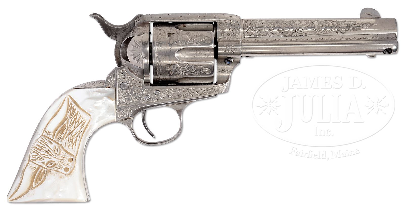 Please Note: As catalog indicates this Colt was factory engraved. Some collectors feel that the engraving is likely Helfrecht engraving rather than Wilber Glahn and we do not disagree. *FINE ENGRAVED COLT FRONTIER SIX SHOOTER SINGLE ACTION ARMY REVOLVER.SN 261251. Cal. 44WCF. Nickel finish with 4-3/4″ bbl. Full front sight & 2-line address with “COLT FRONTIER SIX SHOOTER” roll marking on left side. Bottom of bbl at the frame is marked with a tiny “44”. Left side of frame has 2-line, 3 patent dates and “Rampant Colt” in a circle. Mounted with 2-pc distributor supplied pearl grips that has a raised carved ox head on right side. Revolver is engraved by Wilbur Glahn with about full coverage foliate arabesque patterns on the frame. Left recoil shield and front frame are engraved with hunter stars. Topstrap is stamped with small dots. Engraving patterns extend nearly full length both sides of the bbl and top gullet of ejector housing is engraved in a snake pattern. Cylinder has matching engraving patterns on lands between flutes and it has a dash & dot border around rear edge. top of backstrap is engraved in Mr. Glahn’s distinctive fan pattern with central “V”. Backstrap & trigger bow are engraved in geometric patterns. Accompanied by a Colt factory letter which identifies the revolver in Cal. 44-40 with 3-3/4″ bbl, nickel finish, type of stocks not listed, factory engraved & shipped to H&D Folsom Arms Co., NY, NY on Dec 17, 1904 in a 2 gun shipment. PROVENANCE: The Estate Collection of Phil A. Bleakney, Jr. CONDITION: Very fine. Overall retains about 95% orig nickel showing holster wear around the muzzle and tip of ejector housing. Nickel overall is slightly dulled, brighter on the backstrap & buttstrap. Frontstrap & trigger bow show wear. Grips are sound with an old age line at the top left & show great fire with good color on right side. Mechanics are fine. Bright shiny bore. 49059-89 JR C&R (10,000-15,000) – Lot 3211 Click here to view provenance