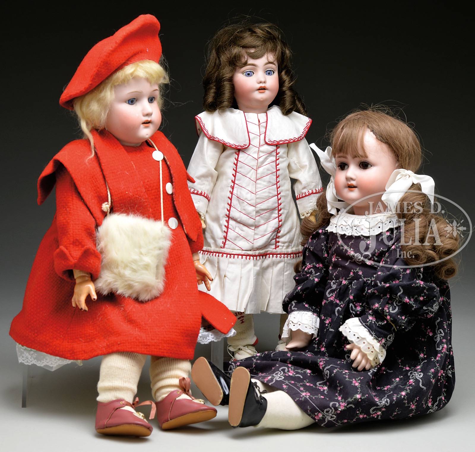THREE GERMAN BISQUE CHILD DOLLS.Largest is incised “SHPB 1909” and has brown glass sleep eyes on a fully jointed body with straight wrists. Next is incised “Heubach-Koppelsdorf 250-6”. She has blue glass eyes which have been set in a stationary position and is on the original fully jointed body, missing one finger. Smallest doll is incised “S&H 1039 DEP” and has blue glass sleep eyes, on the original fully jointed wood and composition body. SIZE: Largest: 23″ t (58cm). Smallest: 20″ t (51cm). CONDITION: All have certain amounts of normal body wear; SHPB doll has piece broken and glued on left side of head, and replacement arms. 1-13666 (400-600) – Lot 3212 Auction: Advertising, Toy & Doll - Spring 2014 Please Note: All prices include the hammer price plus the buyer’s premium, which is paid by the buyer as part of the purchase price. The prices noted here after the auction are considered unofficial and do not become official until after the 46th day. |
