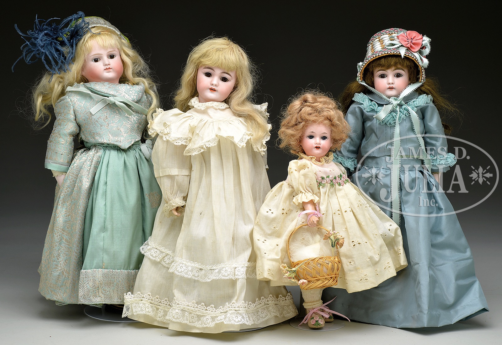 FOUR GERMAN BISQUE HEAD DOLLS.Included are two bisque shoulder head dolls, one with stationary eyes and closed mouth marked “639”, the other shoulder head a Kestner incised “147” with brown sleep eyes and open mouth with four upper teeth. Both are on leather bodies with bisque forearms. The other two dolls are bisque socket heads on composition bodies; the larger marked “79 Handwerck”, having brown glass sleep eyes, a fully jointed body, and wearing original mohair wig and possibly original clothing and shoes; the smaller incised “A.M. 390″ and is on a 5-piece composition body, wearing replaced wig and clothing. SIZE: Tallest: 16″ t (41cm). Shortest: 11” t (28cm). CONDITION: Good to very good; Kestner missing one thumb. 1-13696 (300-600) – Lot 3214 Auction: Advertising, Toy & Doll - Spring 2014 Please Note: All prices include the hammer price plus the buyer’s premium, which is paid by the buyer as part of the purchase price. The prices noted here after the auction are considered unofficial and do not become official until after the 46th day. |