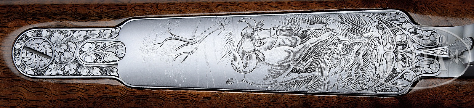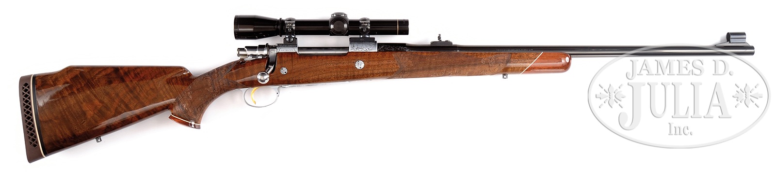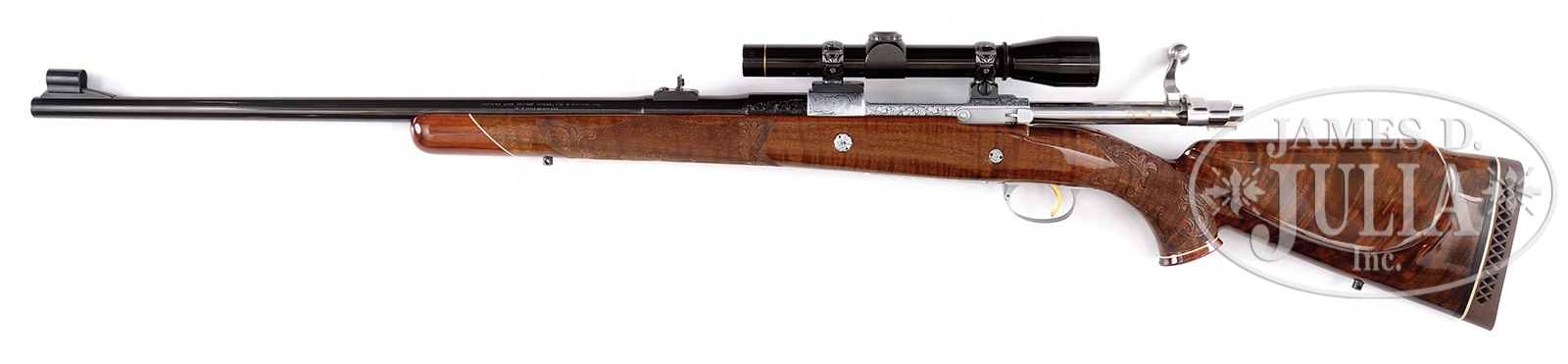 SN 66700L74. Manufactured 1974 with 24″ safari weight bbl with blade front sight and folding express rear sight. Factory engraved and signed by multiple engravers on receiver and floorplate. Coin finish receiver with spectacular highly figured European walnut stock with rosewood forend tip and Browning white line recoil pad. Attached in Redfield bases and Redfield engraved 1″ rings is a Leupold 3X scope with duplex reticle. Receiver is dual game scene engraved with left front receiver ring having a vignette of a large bull elephant with forest scene in background and signed R. Dewil. On right front of receiver ring is engraved a vignette of a walking rhino with forest scene in background and also signed R. Dewil. Balance of receiver is engraved in foliate and arabesque as is chamber area with engraving extending 2″ from receiver. Floorplate is magnificently engraved with a vignette of a charging Cape Buffalo breaking through the brush with foliate and arabesque engraving top and bottom and signed in the vignette ABEE (for Angelo Bee). Trigger guard is similarly engraved in miniature a magnificent lion with head protruding from brush with small forest scene in background and signed AM underneath engraved panel. Strengthening pins through the stock are also coin finish and elegantly engraved in a small florette. The magnificent highly figured Monte Carlo stock is beautifully checkered and carved with elegant scrolls, bordering the forearm and surrounded by extremely fine checkering. Wrist is embellished in same fashion with large scrolls and oak leaf pattern with extremely fine checkering with stippling fore and aft. A rosewood grip cap with gold diamond inlay and finished in a high gloss piano finish that is in super condition. CONDITION: Virtually new, with only the slightest traces of edge wear at very extreme corner of muzzle with no visible imperfections elsewhere in metal. Buttstock has two or three small compression bruises below sling swivel towards toe and one almost indiscernible bruise in forend tip. Rifle has been diligently inspected and there is no issue with salt wood. A truly magnificent triple-signed Olympian. 51033-24 TDW (6,000-10,000) – Lot 3214
