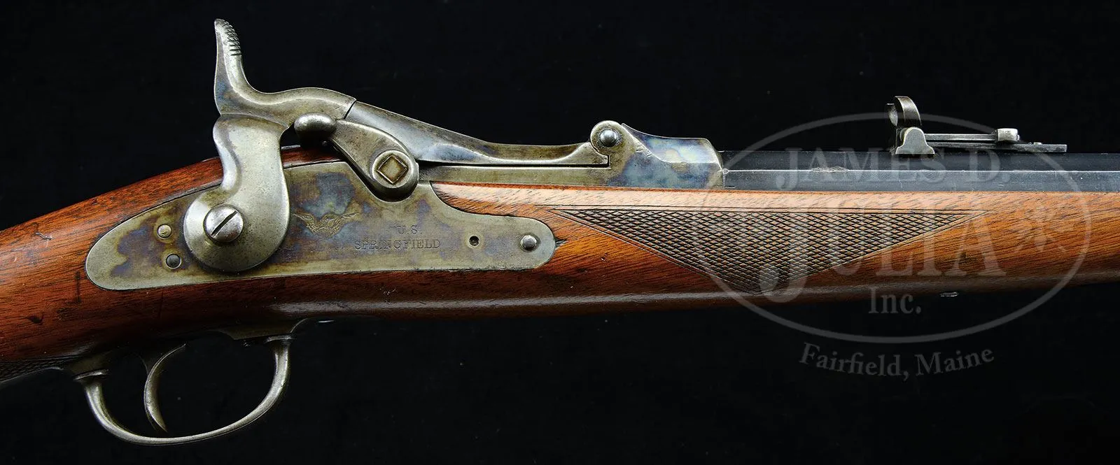 SN 20521. Cal. 45-70. Beautiful sporting rifle with 30″ heavy oct bbl, dovetailed Rocky Mountain style front sight and an unmarked, full buckhorn Sharps ladder rear sight. Bore is rifled in a style similar to Metford rifling found on English rifles and Meacham re-barreled Sharps rifles where Mr. Meecham reportedly used English made bbls for his conversions. Bottom flat of bbl, under the forestock has last three digits of matching serial number. Receiver, breechblock & breech plug are color case hardened with the high arch breechblock having standard 1873 markings. Lockplate & hammer are also color case hardened with lockplate having later style markings of a small eagle and “U.S. Springfield”. Trigger guard is 2-pc style without sling loop and is also color case hardened. Buttplate was probably an orig 1873 style without trap and now has a sliding brass trap like found on Winchester rifles and contains an org 4-pc brass & steel cleaning rod similar to the Winchester style rods but distinctly different and of a style observed with other rifles of this type. Mounted in a 1-pc American walnut stock with checkered black insert, schnable tip forestock and straight grip. This rifle is one of a reported 600 units created from surplus military parts by Whitney Arms Co. for Hartley & Graham of New York who had purchased a large quantity of these surplus military parts. The few surviving pieces that have been observed by this cataloger are all virtually identical and in two different calibers, 45-70 & 40 caliber. Very few survive today with this rifle being the finest known to this cataloger. CONDITION: Very fine to extremely fine. Bbl retains 96-97% strong orig blue; receiver retains most of its orig case colors, strong & bright over the front, faded on the sides; breechblock retains faded case colors; lockplate retains about all of its fine case colors, strong & bright around the hammer, moderately faded toward the front; hammer retains 50-60% faded case colors; trigger plate retains bright case colors in sheltered areas faded elsewhere and on trigger bow; buttplate retains strong case colors on the tang with the balance faded and mixed with mottled brown patina on the face. Stock has a tiny chip in the tip, otherwise wood is sound and retains most of its orig oil finish with light nicks & scratches. Mechanics are crisp; brilliant shiny bore. 4-47916 JR109 (5,000-8,000) – Lot 3216