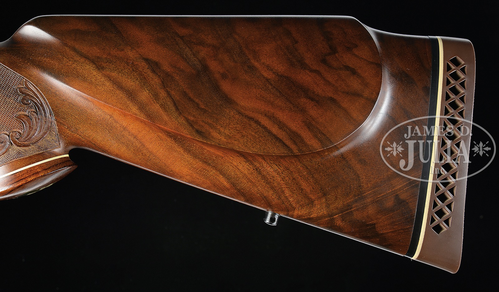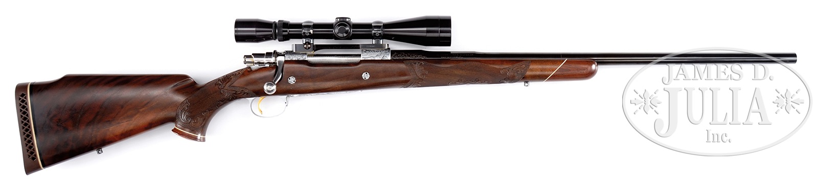 *BAERTEN ENGRAVED BROWNING OLYMPIAN BOLT ACTION RIFLE.SN 9P49148. Cal. 338 WIN MAG. Bbl is 24″ without provision for sights. Breech end of bbl, action, floorplate and trigger guard have full coverage Baerten vine type engraving surrounding games scenes featuring elk on right receiver ring, moose on left, grizzly bear on floorplate and cougar on trigger guard bow. Long extractor FN action has jeweling on extractor with gold plated serrated trigger. High polished blued bbl gives stunning contrast to coin finished action and floor plate. Fitted with Browning 3-9X40 gloss finished scope with standard crosshair on Browning 1-pc mounts. Rare factory original satin oil finished Monte Carlo cheek piece stock of fancy walnut with red & black contrasting tones. Stock is fitted with swivel bases, rosewood forearm tip and flared grip cap having white line spacers. Brass name plate on grip cap bears initials “CAS”. Fine hand checkering with carved foliate scroll borders having punch-dot background. LOP is 13-5/8″ over orig Browning recoil pad. Weight with scope is 9.94 lbs. 1969 Belgian manufacture. Comes in Hartman luggage case with black instruction envelope, key and Browning factory letter. CONDITION: Excellent, essentially as new, appears unfired since proof, with only a few light handling marks on wood and metal. Bbl & action retain nearly all of their orig finish. Stock finish showing minute handling marks and having dark grain streaks in butt section. Scope has clear optics. Very good bore. 50505-1 (5,000-8,000) – Lot 3216 Click here to view provenance