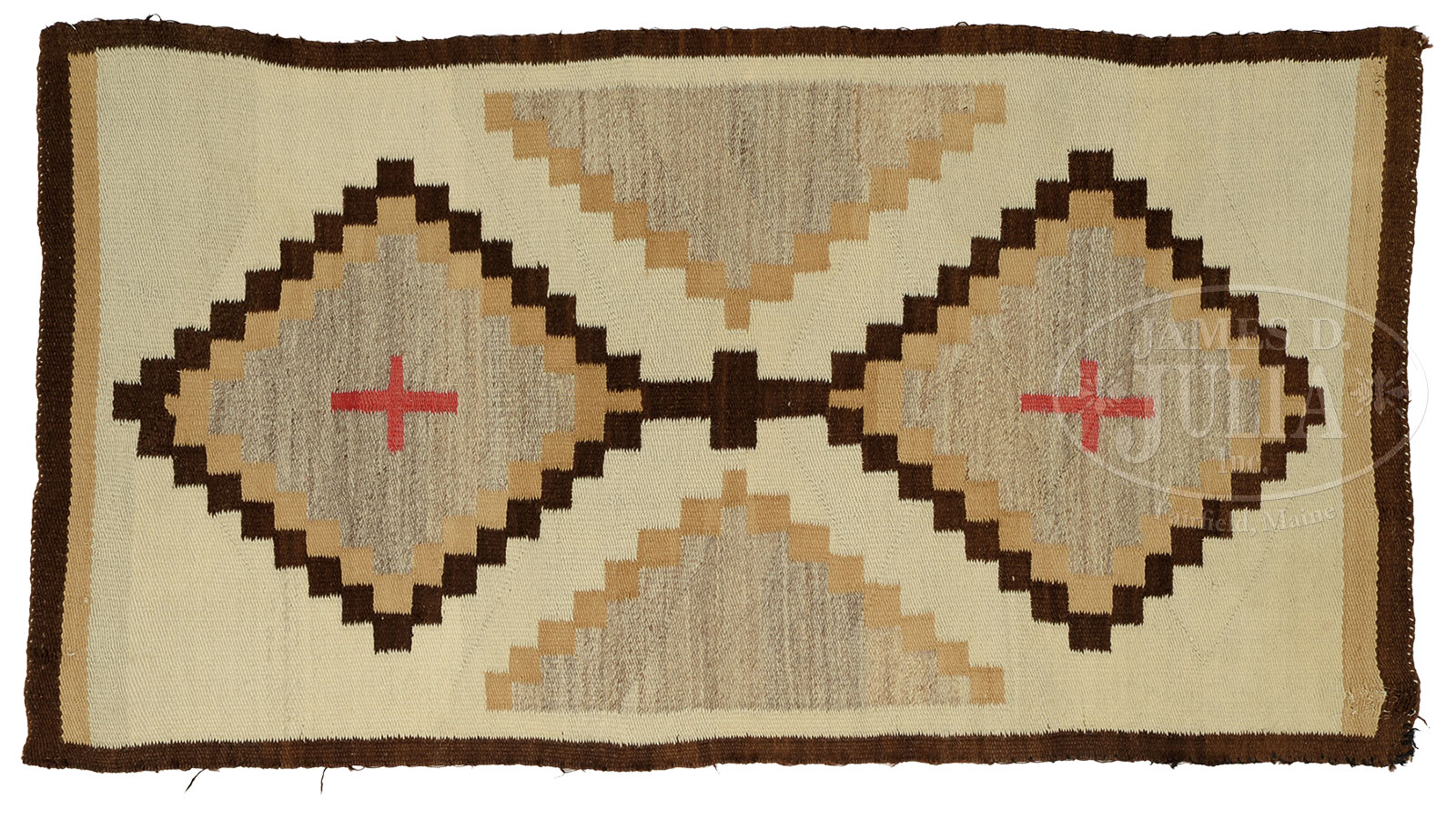 GROUP OF TWO SMALL NAVAJO REGIONAL RUGS TOGETHER WITH PICTORIAL BLANKET.1) Circa 1910, Navajo regional rug in brown, beige, tan, and red. 2) 1920 geometric Navajo rug, natural brown, gray white, and dark brown. 3) Pictorial Navajo rug depicting U.S. flag with 50 white diamonds representing the stars on a bluish/purple field with red and white stripes. United States of America woven into the red and white strips. SIZE: 1) 31-1/4″ w x 58-1/2″ l. 2) 48″ l x 28″ w. 3) 32″ l x 38″ w. CONDITION: 1) Minor wool loss, 3″ area of darning for stabilization. 2) Edge fraying, minor wool loss, minor stains. 3) One small area of yarn pull about 1″ across, otherwise good. 52308-34 (300-400) – Lot 3216
