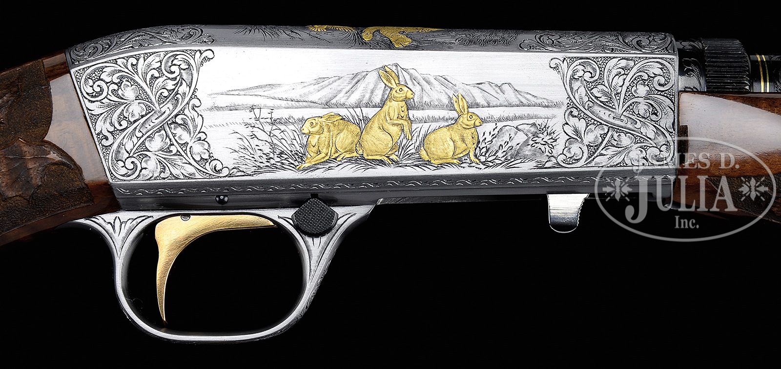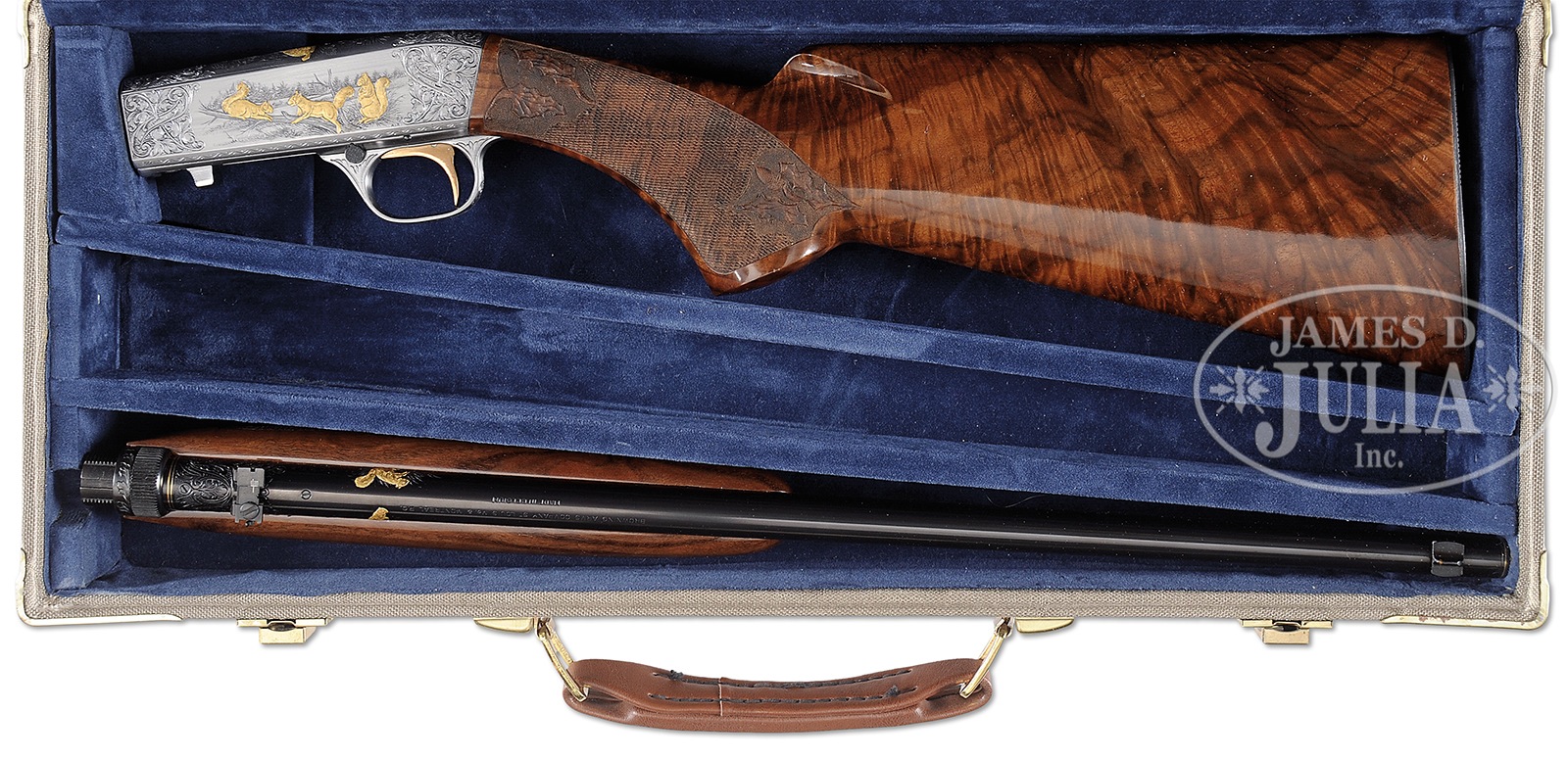 SN 8T81038. Cal. 22 LR. This “one of one”, was featured as the Grand Prize in the 4th Browning Gun Collectors Fund Raiser Drawing held at the Browning annual meeting, April 7, 2001 in Tulsa, Oklahoma. It features standard 19-1/2″ round bbl with usual St. Louis and PQ addresses, along with “MADE IN BELGIUM” on top. Breech section and muzzle are nicely scroll engraved, accented with gold bands. Either side of bbl in front of caliber and patent information, has gold inlaid perched squirrel on left, and prairie dog (?) on right. Coin finished action is engraved with near full coverage superbly cut, open scrolling acanthus with strap work highlights, as often found on “Diana” grade shotguns. This fine scroll surrounds vignettes of small game scenes in nicely detailed backgrounds, the major subjects relief sculpted in gold; pair of squirrels scamper about on a bare branch while another looks on, on left side of action, and a trio of rabbits crouch in grass with mountains in background, on right. Top of action portrays an interesting scene of bobcat swatting at departing quail (?) in woodland background. This interesting work is signed “A Bee” under Bee logo at bottom rear squirrel scene. Superb flame figured crotch American walnut square knob pistol grip buttstock measures 13-7/8″ over engraved steel buttplate. Checkering at grip is flanked by relief carved oak leaves and acorns. Forend matches well. Drop at heel: approx 2-5/8″, drop at comb: approx 1-5/8″. Weight: 5 lbs. 0 oz. LOP: 13-7/8″. Gray canvas Browning case with brown leather trim, is lined in blue velvet and has oval brass plaque in lid engraved “BROWNING 22 AUTO”. Gun is accompanied by framed copy of the orig advertising for the raffle of this gun, as well as certificate of authenticity signed by Angelo Bee for this gun dated 4/4/2000. PROVENANCE: Framed documents. CONDITION: Excellent, essentially as new, appears unfired since proof, with only the faintest of handling and assembly marks on wood and metal. Case is excellent. Certificates are excellent. A unique opportunity for the Browning collector. 50670-1 MGM310 (15,000-25,000) – Lot 3219