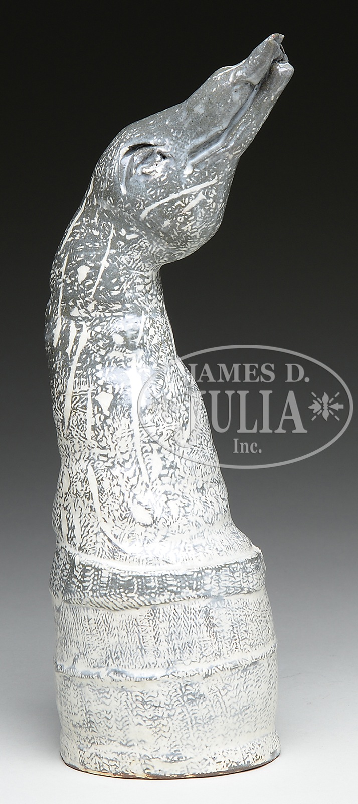 SHIN SANG-HO (Korean, 1947- ) FIGURE OF A BIRD.Korea, 20th century. The pottery sculpture depicting a bird with head raised finished in a grey and white glaze. Signed “Sang-ho” just above the foot and dated “92”. SIZE: 13″ h. CONDITION: Small glaze flake to beak. 49818-60 (300-400) – Lot 3221