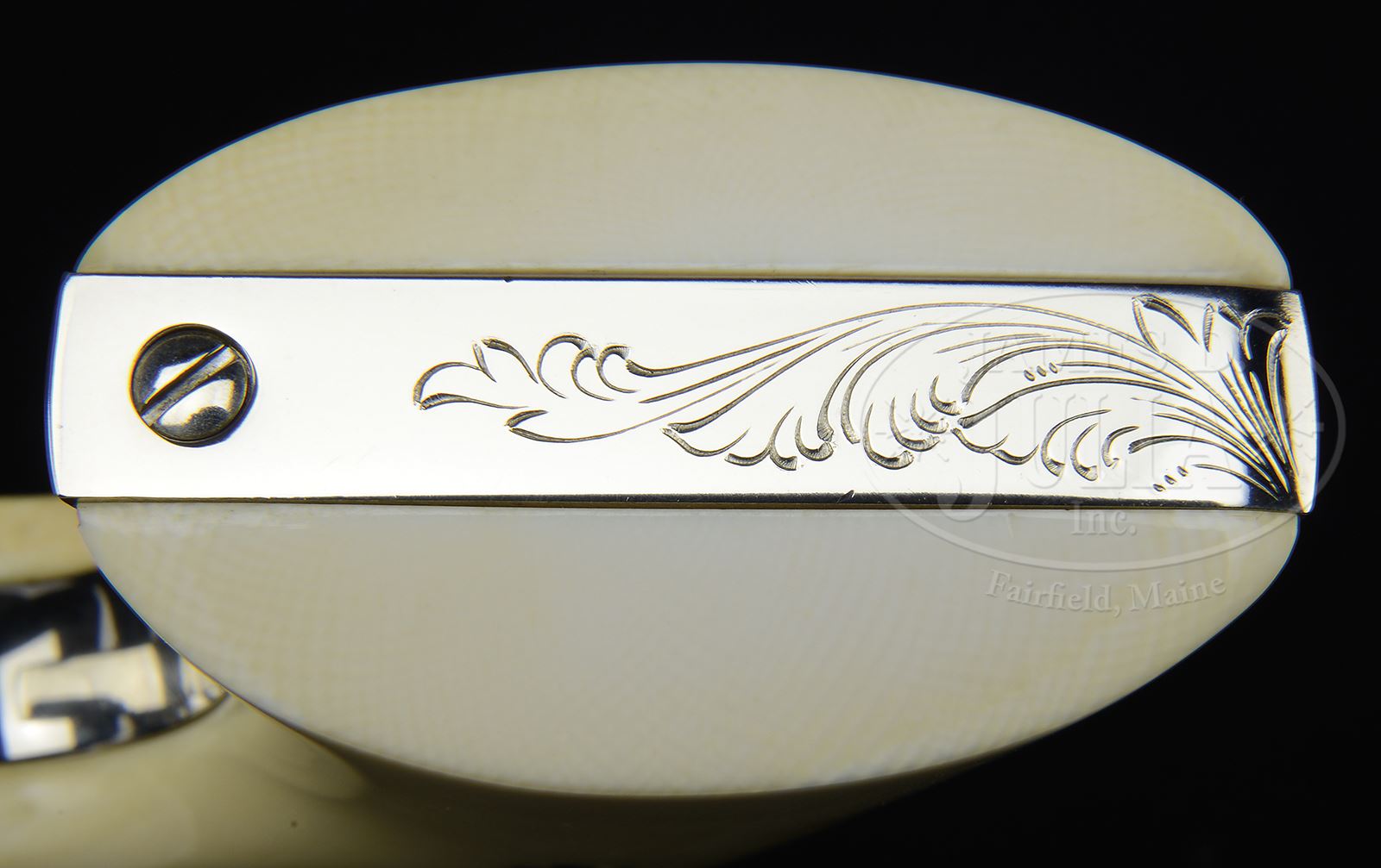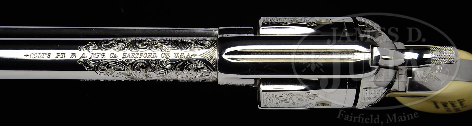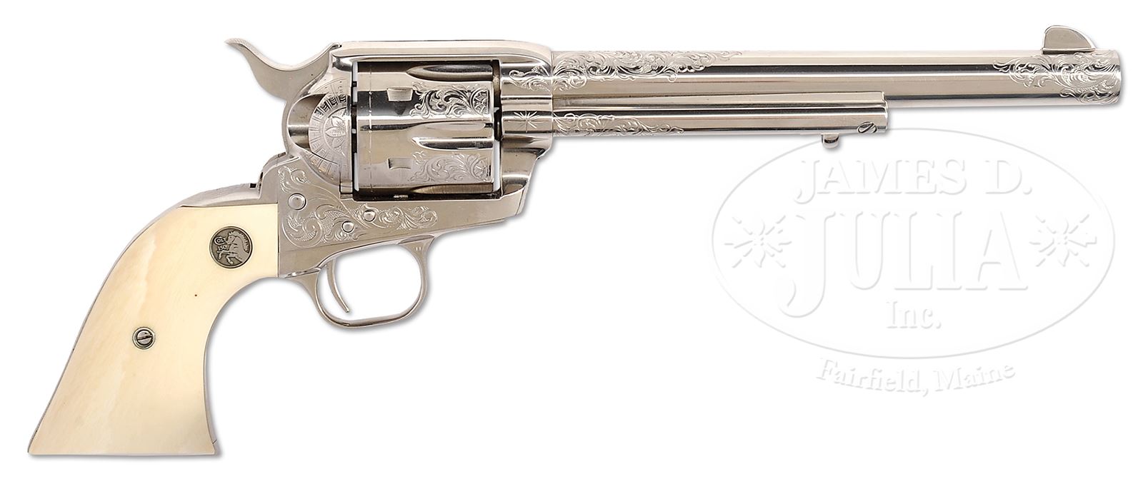 *COLT ENGRAVING SAMPLER SINGLE ACTION ARMY REVOLVER.SN SA65240. Cal. 44-40. Nickel finish with 7-1/2″ bbl, full front sight and 1-line early style script letter address. Left side of frame has 3-line patent dates. Left side of front and back straps, under the grip are marked with matching SNs. Mounted with smooth 2-pc “certifiable pre-ban ivory” grips with Colt custom shop 150th Anniversary silver medallions, matching numbered to this revolver. Left grip is inscribed in 4 lines with the 4 different styles of engraving and the dates they were employed at Colt. Revolver is engraved in 4 different styles in “B” coverage. Backstrap is engraved “Colt Engraving Sampler”. Accompanied by a Colt Factory letter which identifies this revolver in cal 44-40 with 7-1/2″ bbl, nickel finish, smooth Ivory stocks and shipped to Service Armament Co., Ridgefield, NJ, on Aug 22, 1988. Remarks section details the 4 different styles of engraving and states that the records show the engraving was done by John Adams. Mr. Adams was a master engraver at Colt for many years. Letter further states “In addition, it is interesting to note that subject revolver is one of 8 single action army revolvers produced in the Sampler Edition in the above noted configuration”. Accompanied by its orig gray velvet lined custom shop walnut casing, compartmented in the bottom for the revolver, a pearl bits box with the “Colt” logo on the lid, a pearl oil bottle with the same logo on top of the dipper knob, a gold washed turn screw with pearl handle, a brush with pearl handle and gold ferrule and a gold washed, pearl handled cleaning rod. Additionally accompanied by its orig wood grain, Styrofoam lined, 1-pc cardboard box containing; instruction manual, a couple of other small booklets and hang tag. Special Note: This item contains or is made of ivory. Do not bid on this lot unless you have read and agreed to our "Ivory Position Statement" and the "Waiver of Legal and Financial Risk to James D. Julia in regards to your Purchase of an Ivory Object." This information is located in the front section of our catalog. CONDITION: Exceptionally fine, new and unfired. Walnut case is equally fine and new. Cardboard box is missing the custom shop end flap and shows considerable edge wear with some tears. 49432-111 JR C&R; IVORY (6,000-10,000) – Lot 3222 Click here to view provenance