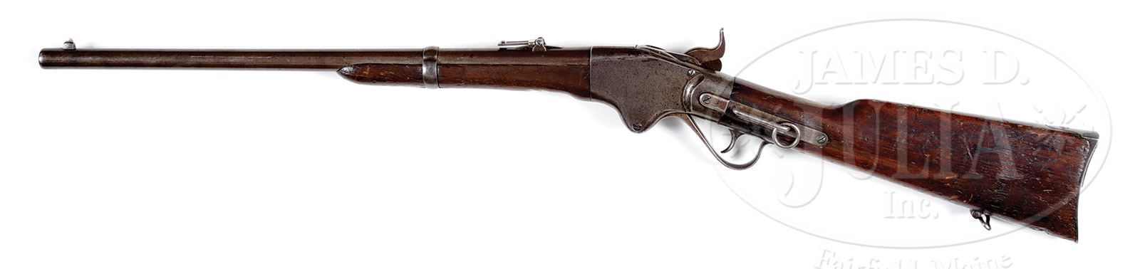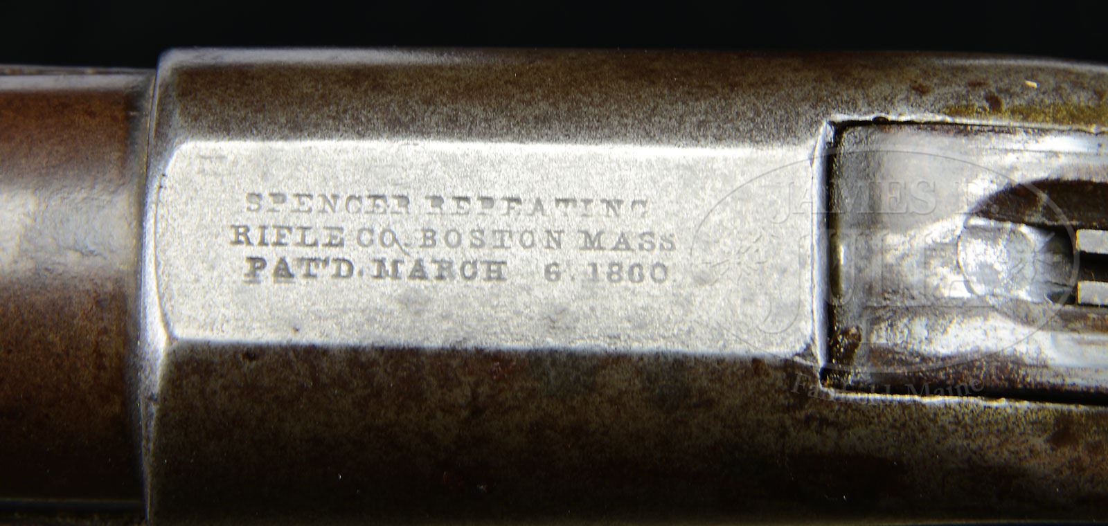 CIVIL WAR SPENCER CARBINE.SN 14140. This is a very nice orig and authentic “as found” Civil War Spencer carbine that shows honest saddle wear from the Greene Museum. This gun conforms to other early issued Spencer carbines with better than average markings on receiver flat “SPENCER REPEATING/RIFLE CO BOSTON MASS/PAT’D MARCH 6 1860″, 22″ bbl mounted on straight grained walnut stock. This is a nice unaltered example of the popular Civil War Spencer carbine. PROVENANCE: Greene Museum of Southern History. CONDITION: Very good overall with gray/brown fairly smooth metal with scattered staining and pitting. Stocks are sound with numerous small dings, dents and scratches with hand worn patina. There is a 1” chip at toe with some erosion which retains same patina. Buttstock has some light soldier scratched in decorations with indiscernible possible unit and/or initials. Front German silver blade to sight has been filed and sharpened. Mechanically gun functions well with good bore with discernible rifling though pitted. 4-54250 JS304 (2,000-4,000) – Lot 3223