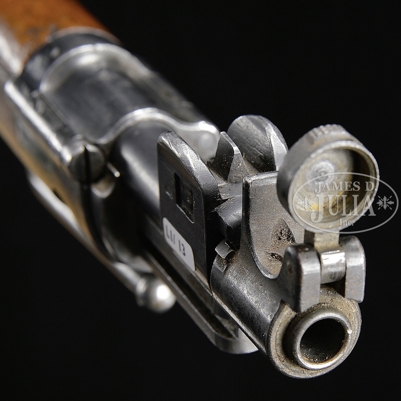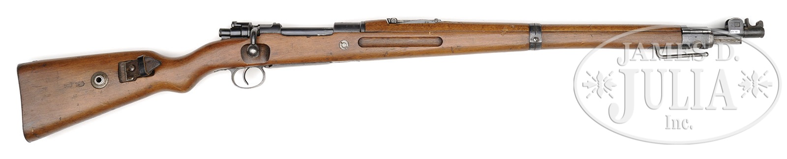 *◊ SCARCE WORLD WAR I KAR 98AZ MADE BY BY THE DANZIG ARSENAL IN 1918.SN 6433. Cal. 7.92mm. Very scarce, all matching World War I carbine, reissued after the war in accordance with the Treaty of Versailles and overstamped with the date “1920” as a property mark, and used by the post-war Reichswehr. Rifle is Prussian and Weimar proofed throughout. Carbine is in correct 98AZ configuration, all metal parts including trigger guard screws and stock match each other, both receiver top and left stock have been given an additional “1920” date. Comes with serviceable authentic orig Weimar area sling and correct period spring loaded muzzle cover marked “R.STOCK & CO.” PROVENANCE: Collection of Dr. Geoffrey Sturgess. CONDITION: Very Good. Bluing is over 90% with most wear at stacking rod, high edges and bayonet stud. Bore is lightly frosted, strong lands and grooves, but should clean up. Stock shows just a few handling marks and is overall very nice condition. 4-53136 DW9 (1,000-1,750) – Lot 3224