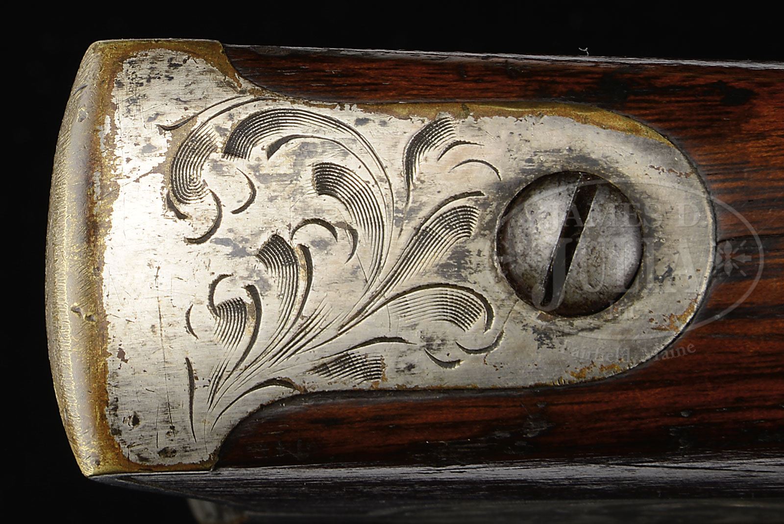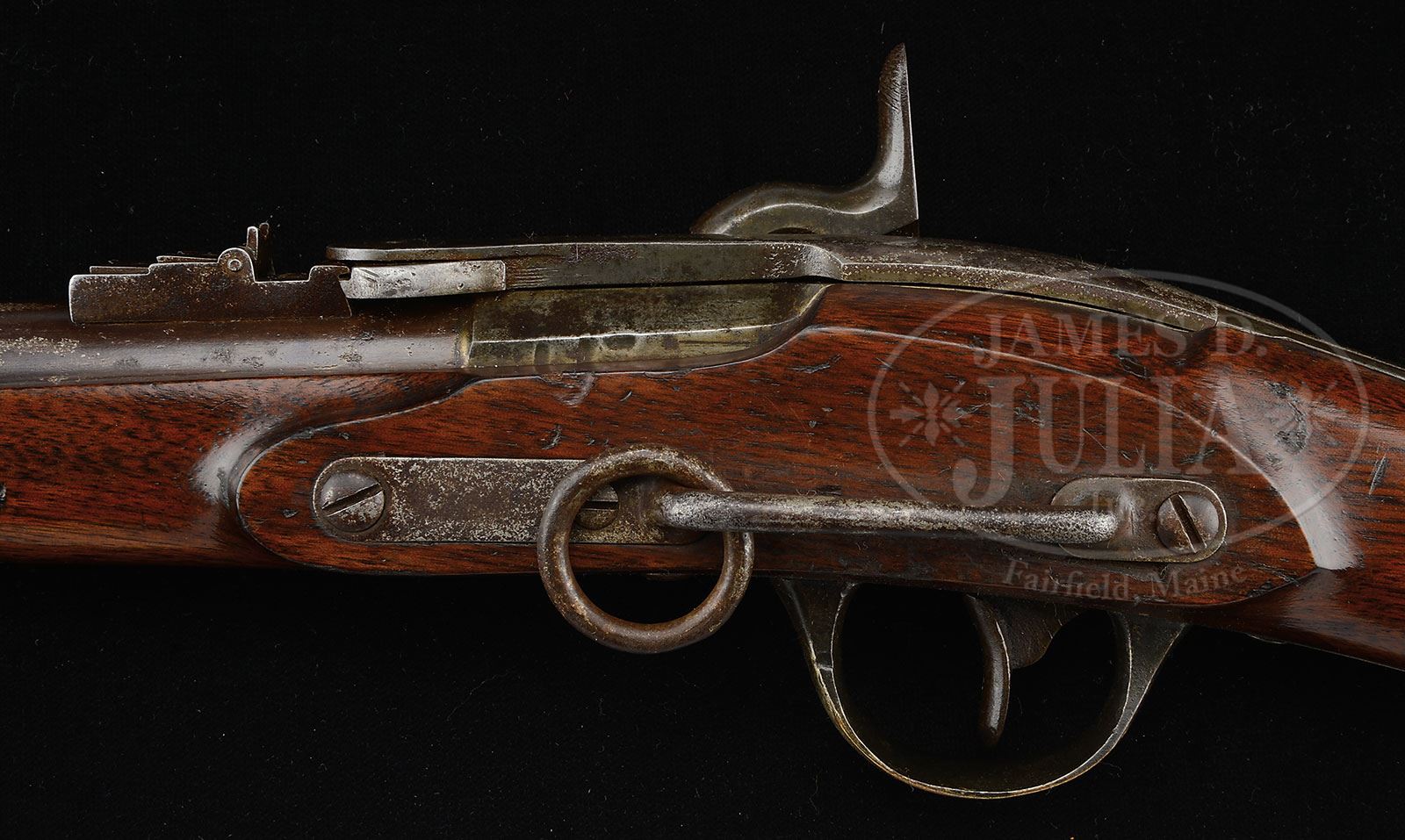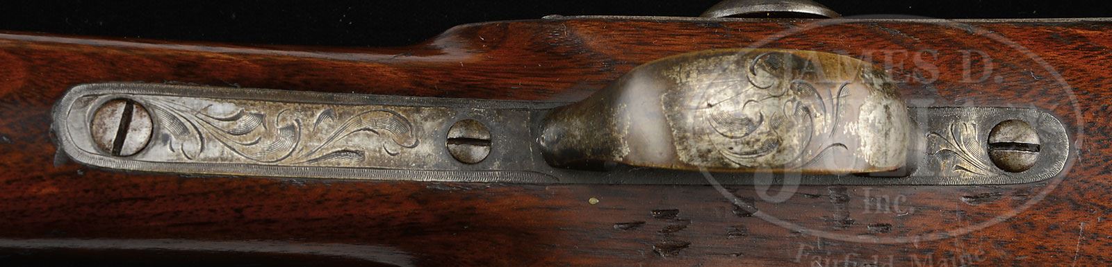 RARE ENGRAVED CIVIL WAR FIRST MODEL MERRILL CARBINE.SN 4295. 54 Cal. Often known as officer models, the handful of engraved first model Merrill carbines are quite scarce and all very different. This particular example has engraving only to brass components patchbox, trigger guard, buttplate and bbl band. These components are all engraved and silver plated as can be seen in photos. Stock is also highly finished, strait grain and varnished. These are the only distinctions from the standard military carbine that saw hard use during the Civil War. One famous commander who armed his troops with these guns was General Benjamin Grierson who fought in the western theater of war whose exploits were portrayed with cinematic license by John Wayne in his famous movie “The Horse Soldiers”. A decorated gun like this could have been carried by one of his officers. Conforms to other standard production guns with makers marks on lock and breech as can be seen in photographs. This scarce gun is all orig, authentic and in beautiful “as found” condition. PROVENANCE: Estate Collection of Lewis & Leyton Yearout. CONDITION: Very good to fine overall. Engraved buttplate and patch box retain about 90% orig silver plate. Engraved bbl band and trigger guard retain about half orig finish. Iron surfaces of bbl and breech are brown/plum overall with large areas of freckling and pitting on bbl and pitting on breech. External SN 4295 is found on lock and lever. Stock is sound and solid retaining about 90% orig varnish with a 3″ crack at wrist between lock and end of breech as can be seen in photos. Mechanically gun functions well with crisp rifling in bore. 4-53801 JS38 (5,000-8,000) – Lot 3224 Click here to view provenance