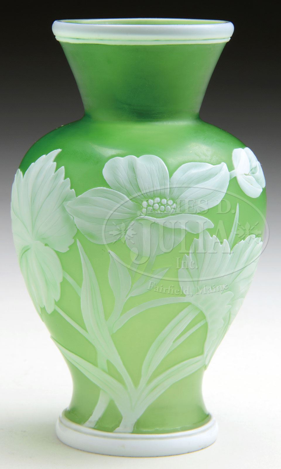 GREEN ENGLISH CAMEO VASE.Rare English cameo vase features white cameo flowers, stems and leaves against a green ground. Vase is finished with two white cameo bands at the rim and a single white cameo band at the foot. Unsigned. SIZE: 5-1/4″ t. CONDITION: Very good to excellent. 5-60145 (600-900) – Lot 3225