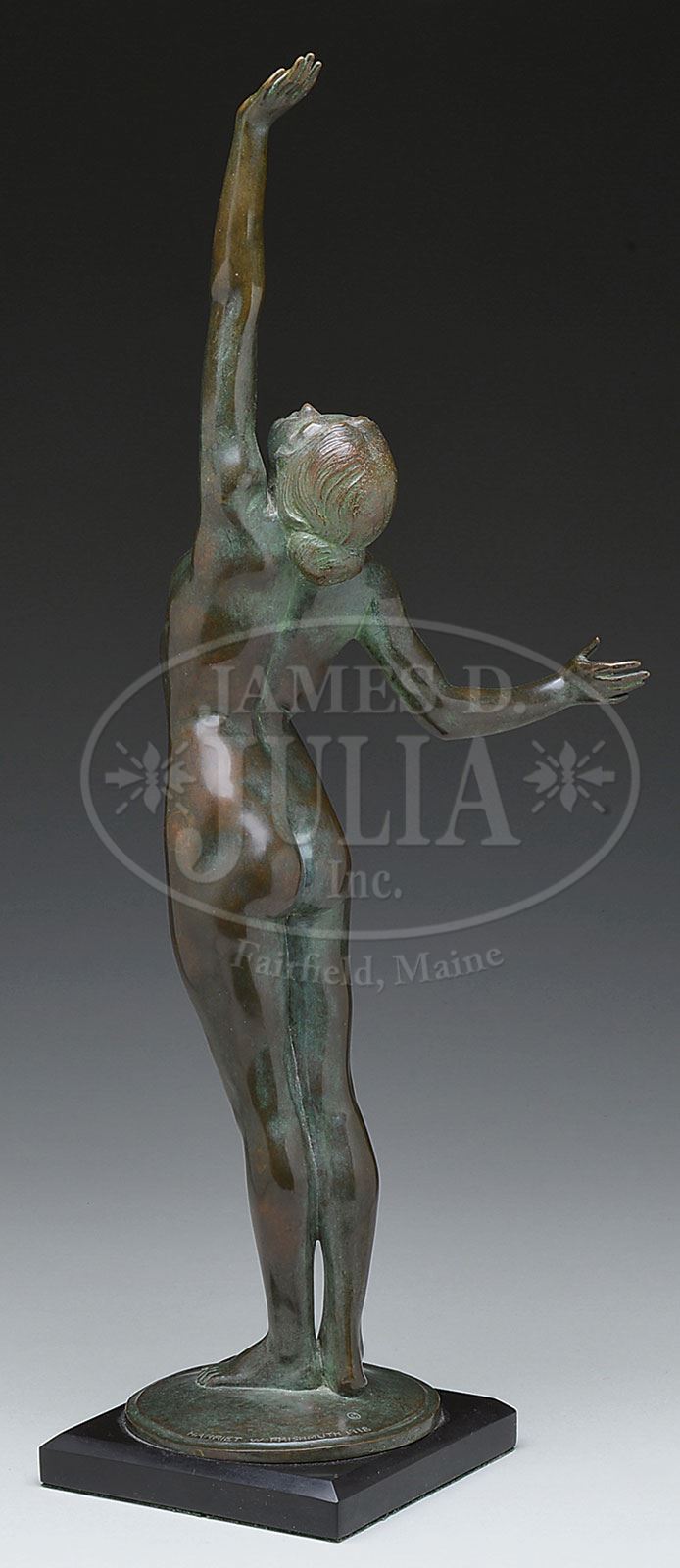 HARRIET FRISHMUTH NUDE BRONZE.Harriet Frishmuth bronze entitled “The Star” depicts a nude maiden gazing at the sky with one arm raised. Sculpture was modeled in 1918 in an edition of 345. It is finished with its original dark brown patina with green highlights. Signed on the foot “Harriet w. Frishmuth 1918” and also stamped with Foundry mark “Gorham Co. Founders O505 #306”. SIZE: 20-1/4″ t. PROVENANCE: From the collection of Charles N. & Josephine R. Aronson to present owner. Illustrated in the book “Sculptured Hyacinths” by C. N. Aronson. CONDITION: Very good to excellent. 5-69478 (17,500-22,500) – Lot 3228
