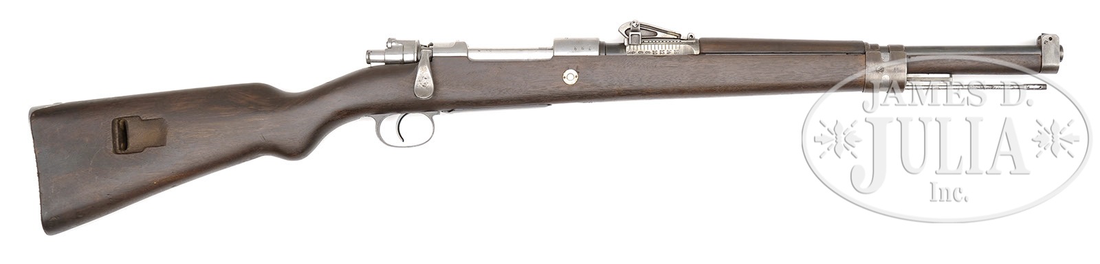 *◊ EXCELLENT ERFURT ARSENAL PRODUCED KAR.98 CARBINE.SN 4265. Cal. 7.92mm. Exceptional as refinished Erfurt Arsenal Karbiner 98 produced in 1905. The Kar 98 was developed for use by soldiers who did not require a full length rifle such as cavalry troops & field artillery troops. This example has the correct bent spoon bolt handle and is all matching including the trigger guard screws. Includes period cleaning rod. PROVENANCE: Collection of Dr. Geoffrey Sturgess. CONDITION: Overall excellent as restored. Bluing is approx 99% with the rear sight & receiver top in the white. Stock is excellent as refinished & numbered to the gun. Checkered bolt handle has some pitting & stress crack at the bend. Bbl is bright and shiny with strong lands & grooves. 4-53133 DW18 (650-1,500) – Lot 3229